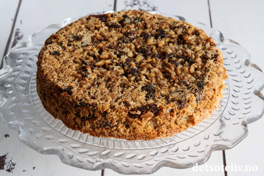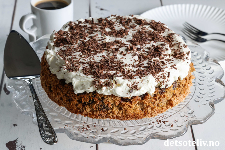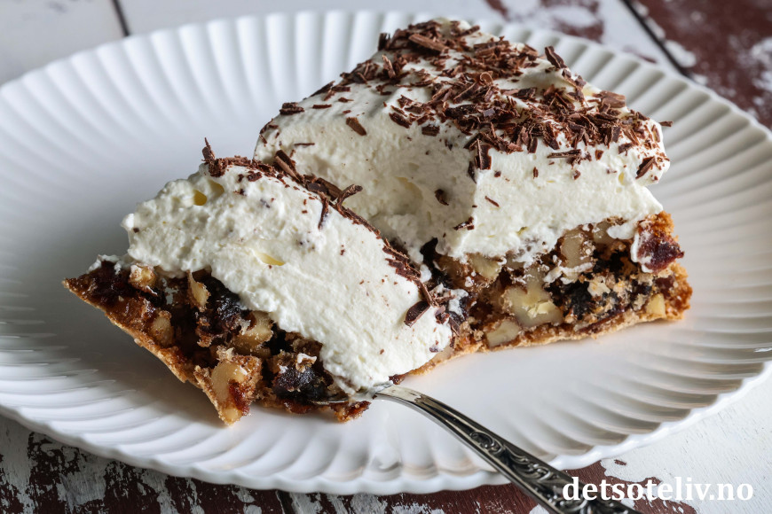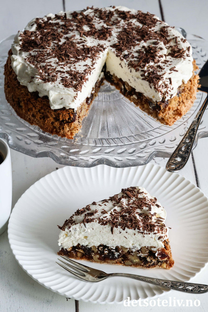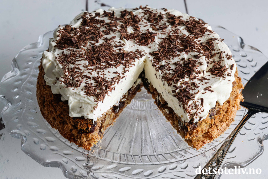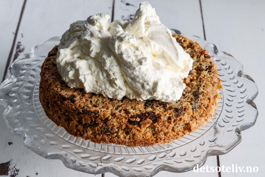 Kaken er utrolig myk og saftig og inneholder nesten ikke noe mel. Kakebunnen har lekker smak av dadler og valnøtter og smaker faktisk kjempenydelig som den er (du får da også en kake som inneholder nokså lite fett).