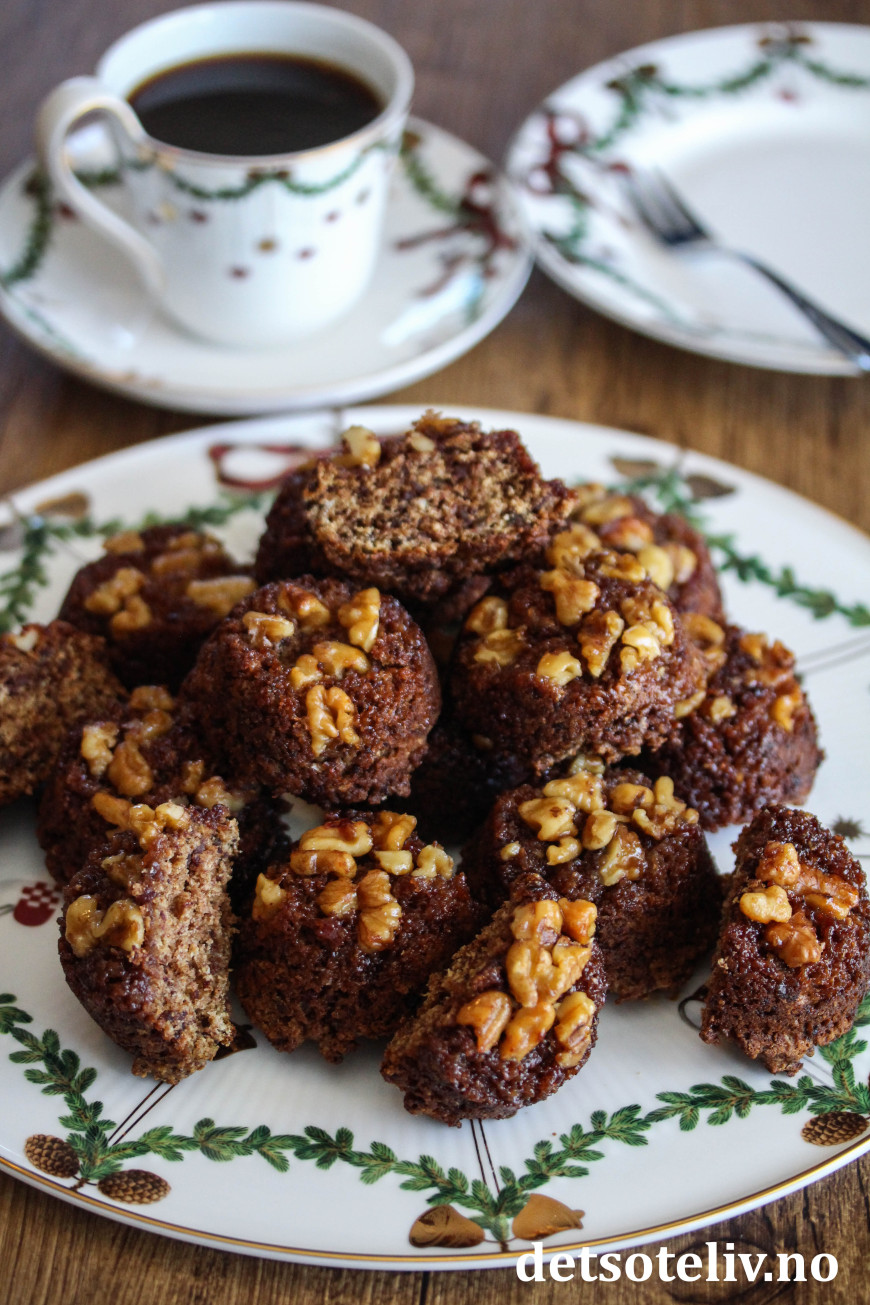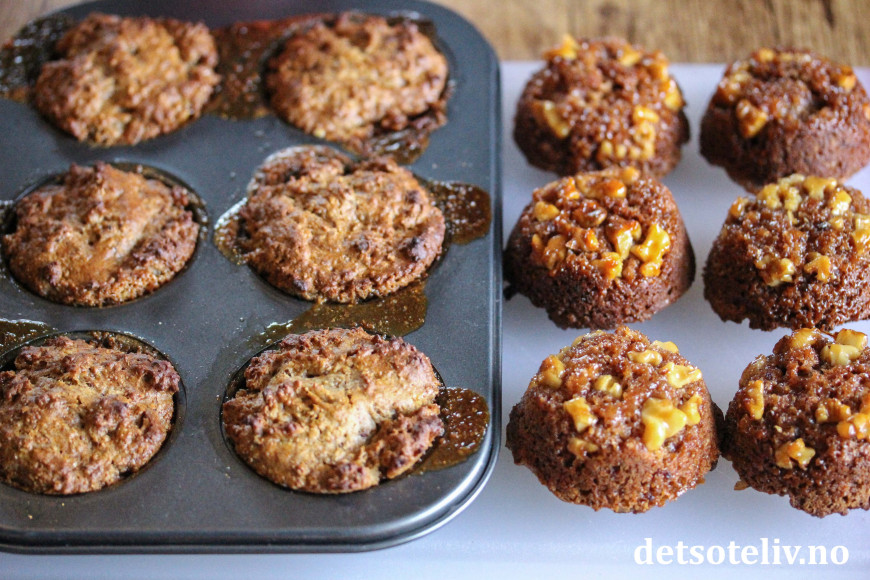 ♥ Det er viktig at du avkjøler de stekte muffinsene i et par minutter før du hvelver dem ut av muffinsbrettet. Venter du for lenge, stivner glasuren og muffinsene går i stykker når du skal hvelve dem ut. Venter du ikke i det hele tatt, er glasuren for rennende. Eventuelle valnøtter som faller av muffinsene når du tar dem ut av formen kan du klemme på muffinsene. De vil feste seg til muffinsene etter hvert som honningglasuren stivner.