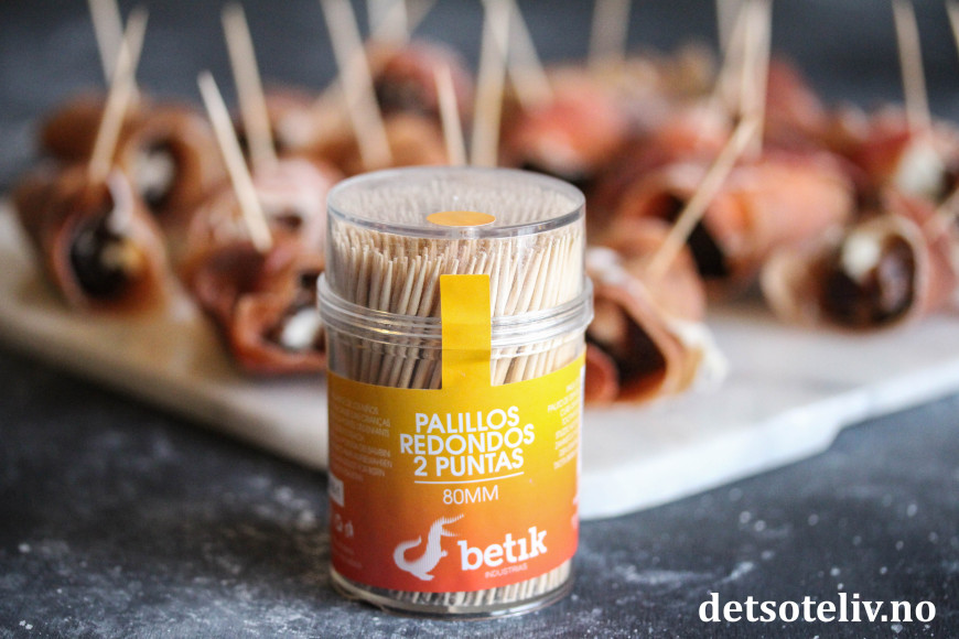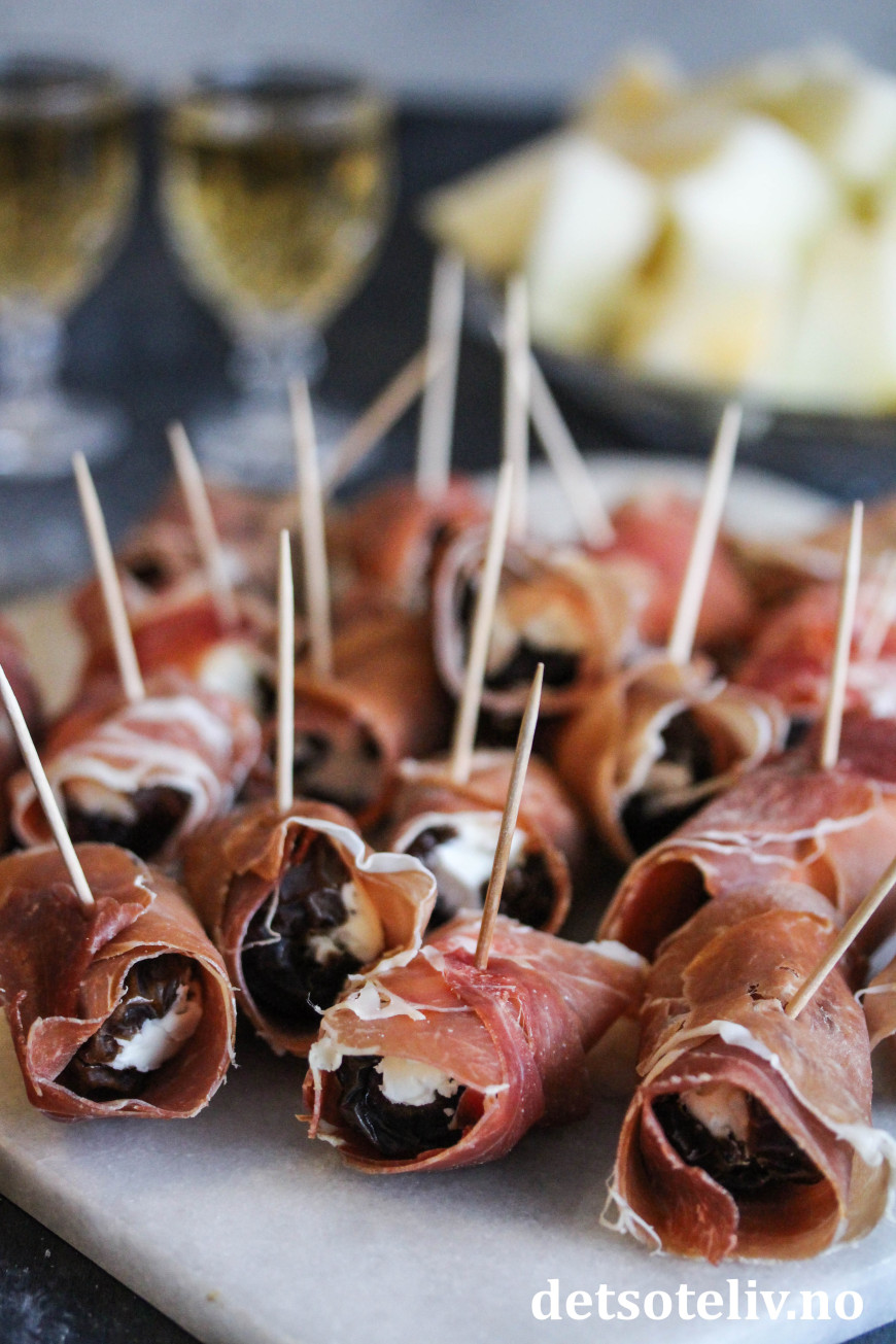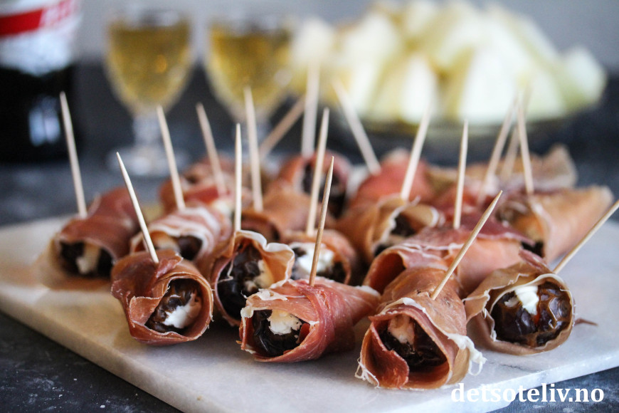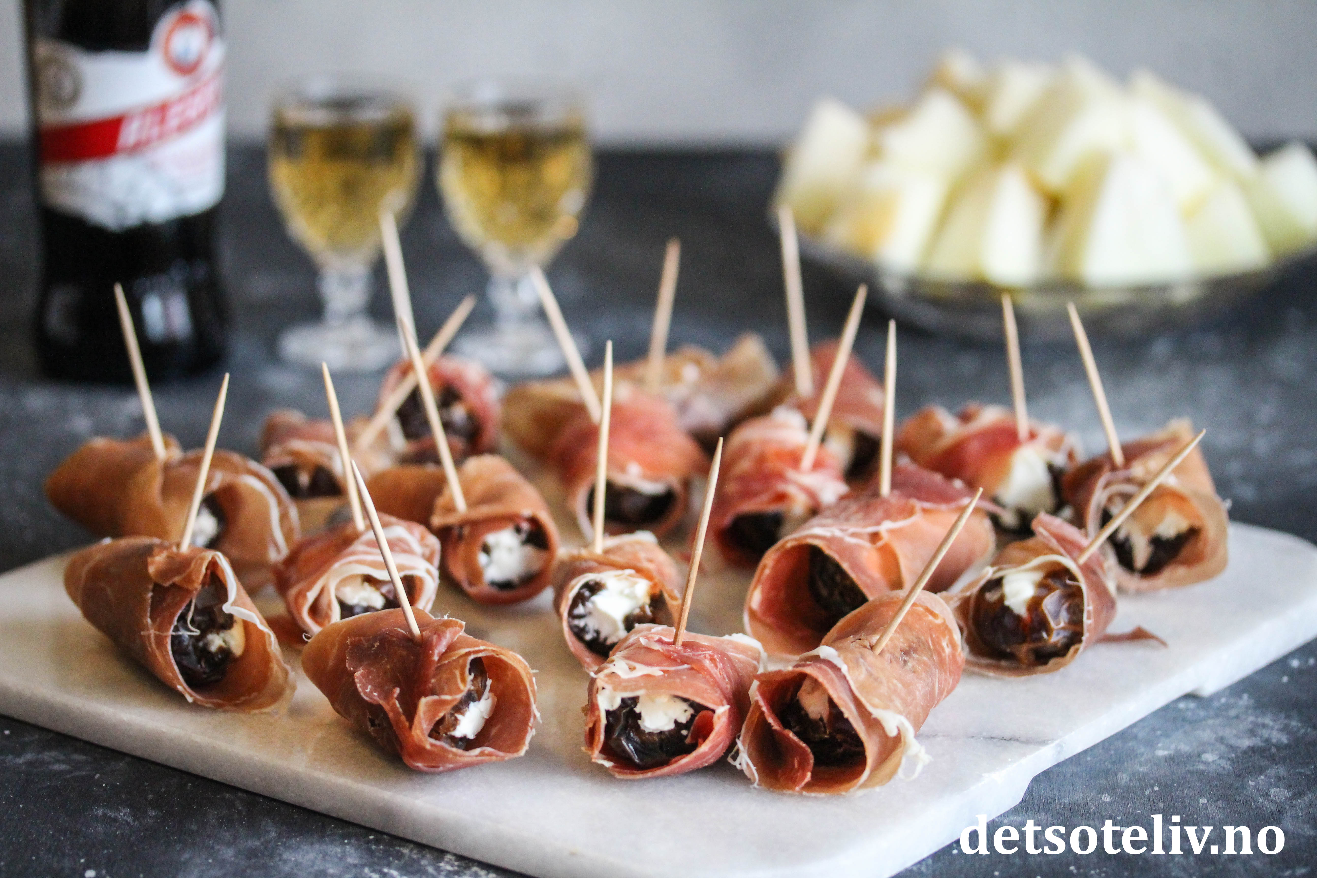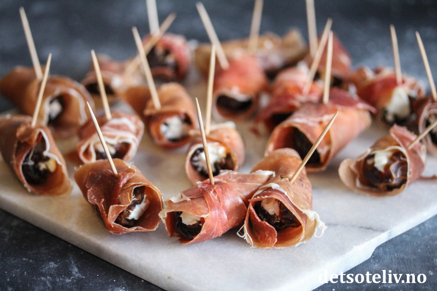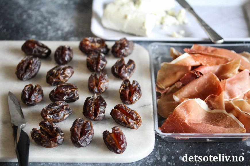 Dette er fingermat som er veldig lett å lage. Dadlene gjør seg også godt som tapasrett eller på koldtbordet.