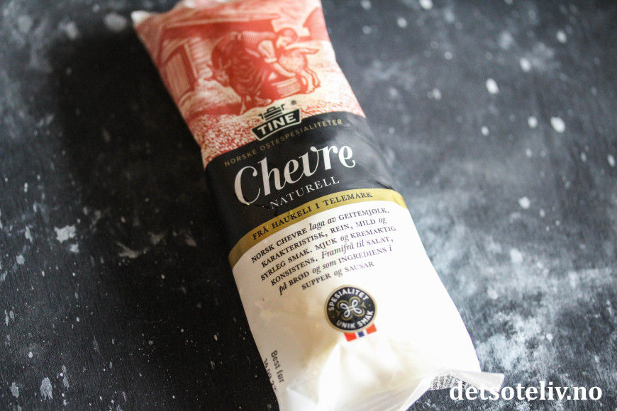 ♥ Jeg har her brukt chèvre naturell som er fersk, dvs. at den ikke har skorpe rundt. Jeg brukte en rull Chèvre Haukeli Naturell som er på 190 gram, men andre varianter kan selvfølgelig også brukes, men det bør altså være fersk chèvre uten skorpe.