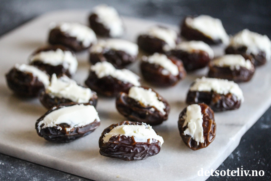 Fyll hver daddel med en stor teskje chèvre.