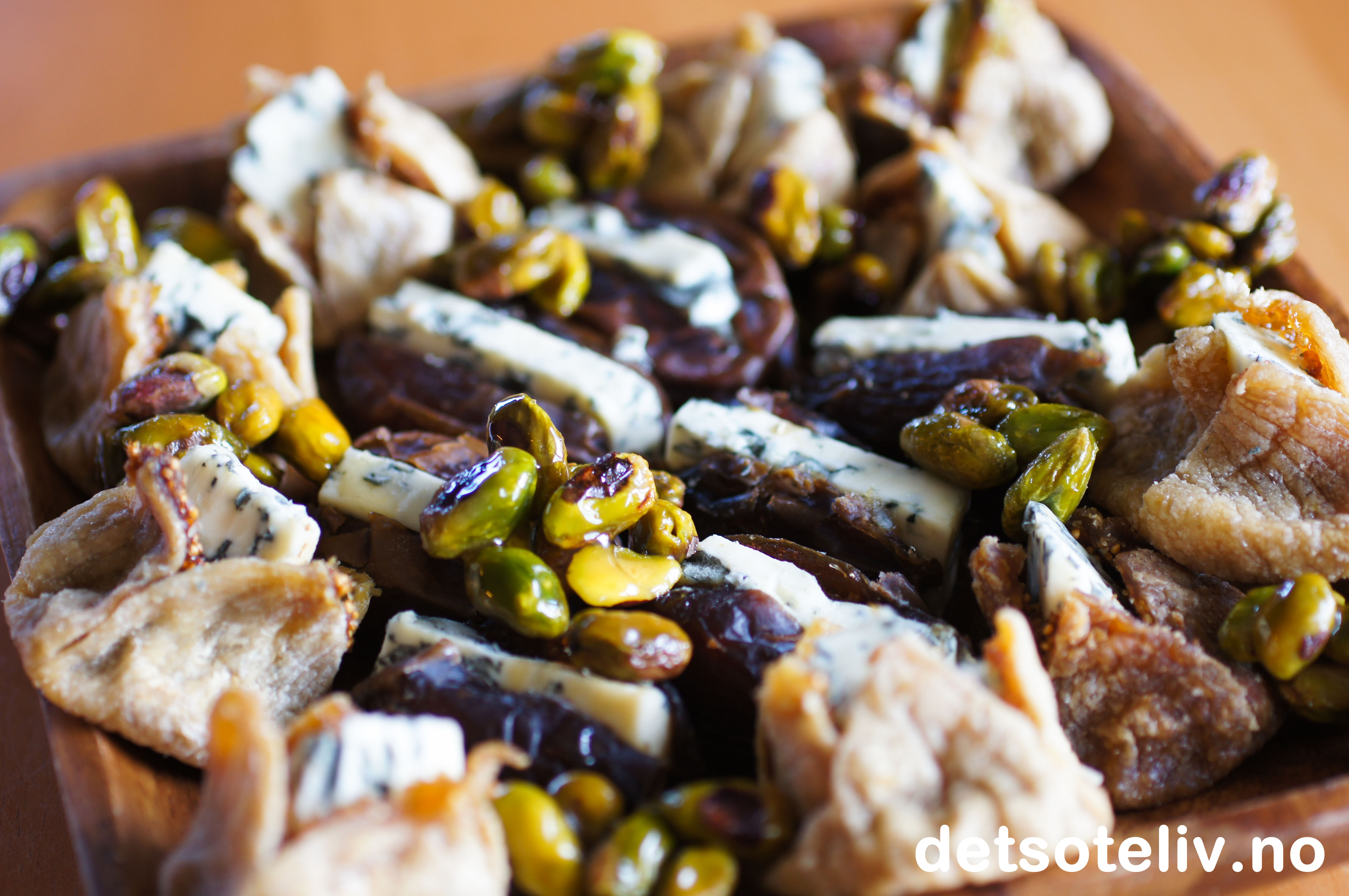 Del blåmuggost i passe store biter og legg en bit i hver fiken og daddel.