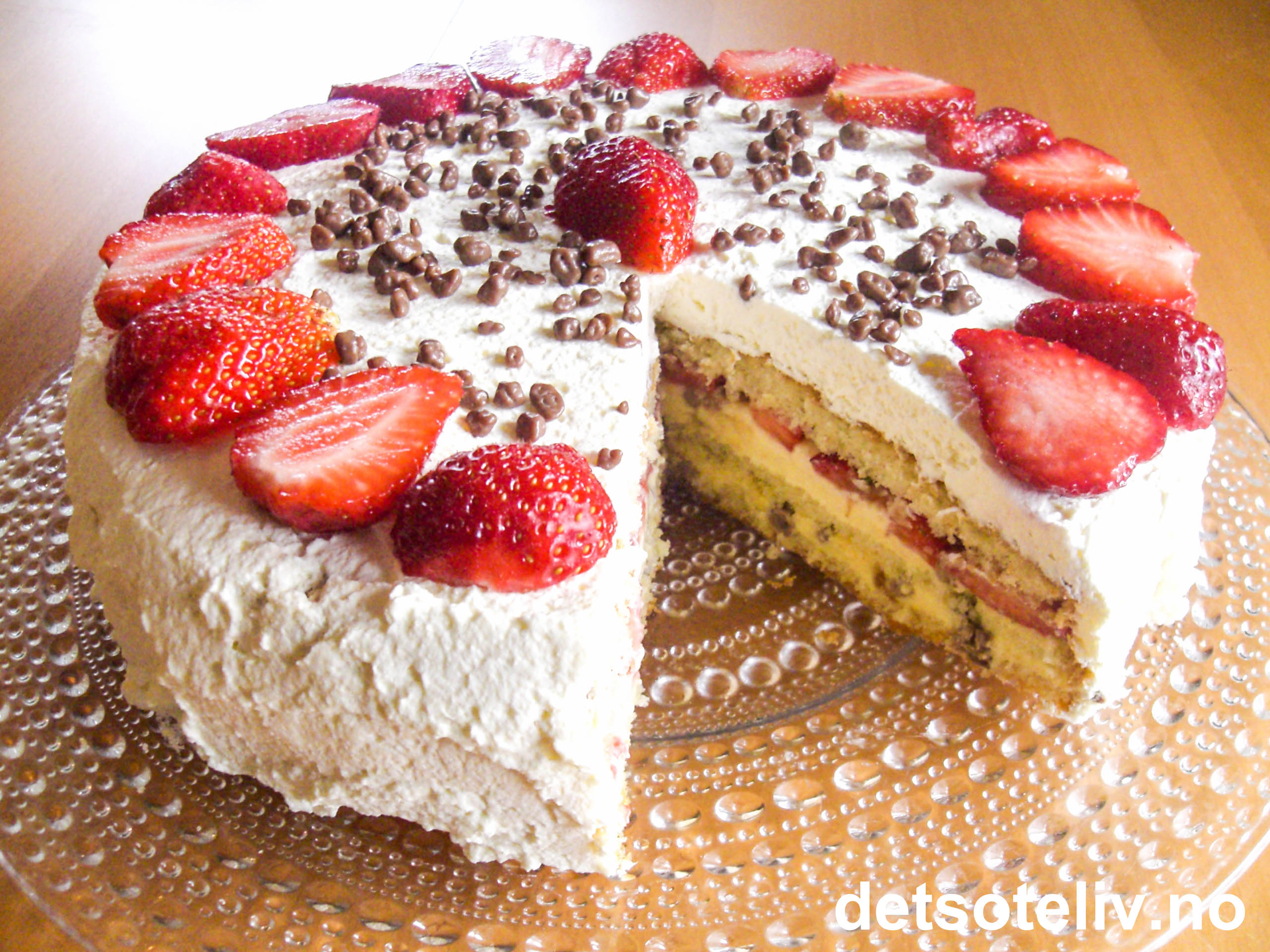 Se også oppskrift på "Bløtkake med daimstrøssel", som lages med jordbærsyltetøy i stedet for med friske jordbær.