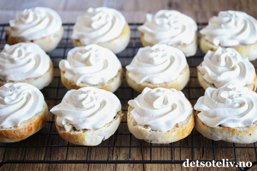 Del bollene på midten og sprøyt på rikelig med krem. Legg på den øverste delen av bollene, sikt over melis og server!