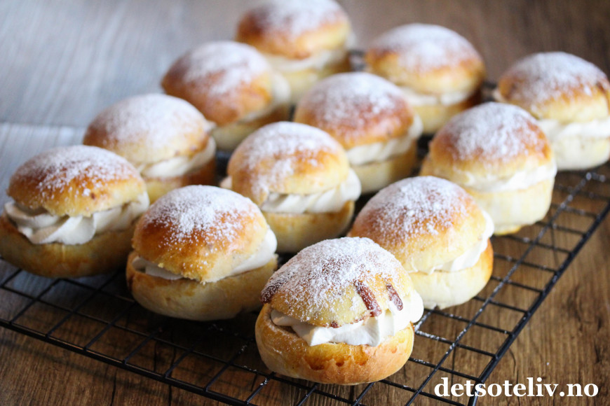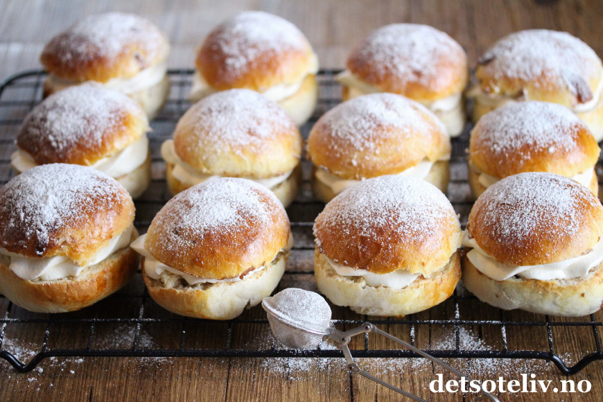 Til fastelavns er det nydelig å dele bollene på midten og fylle dem med pisket fløtekrem. Sikt over melis på toppen og nyt!