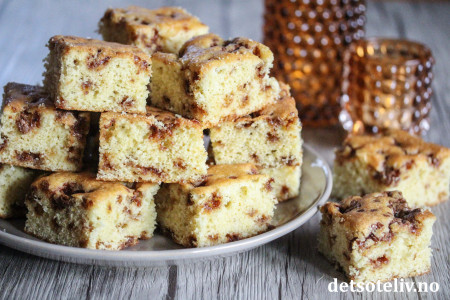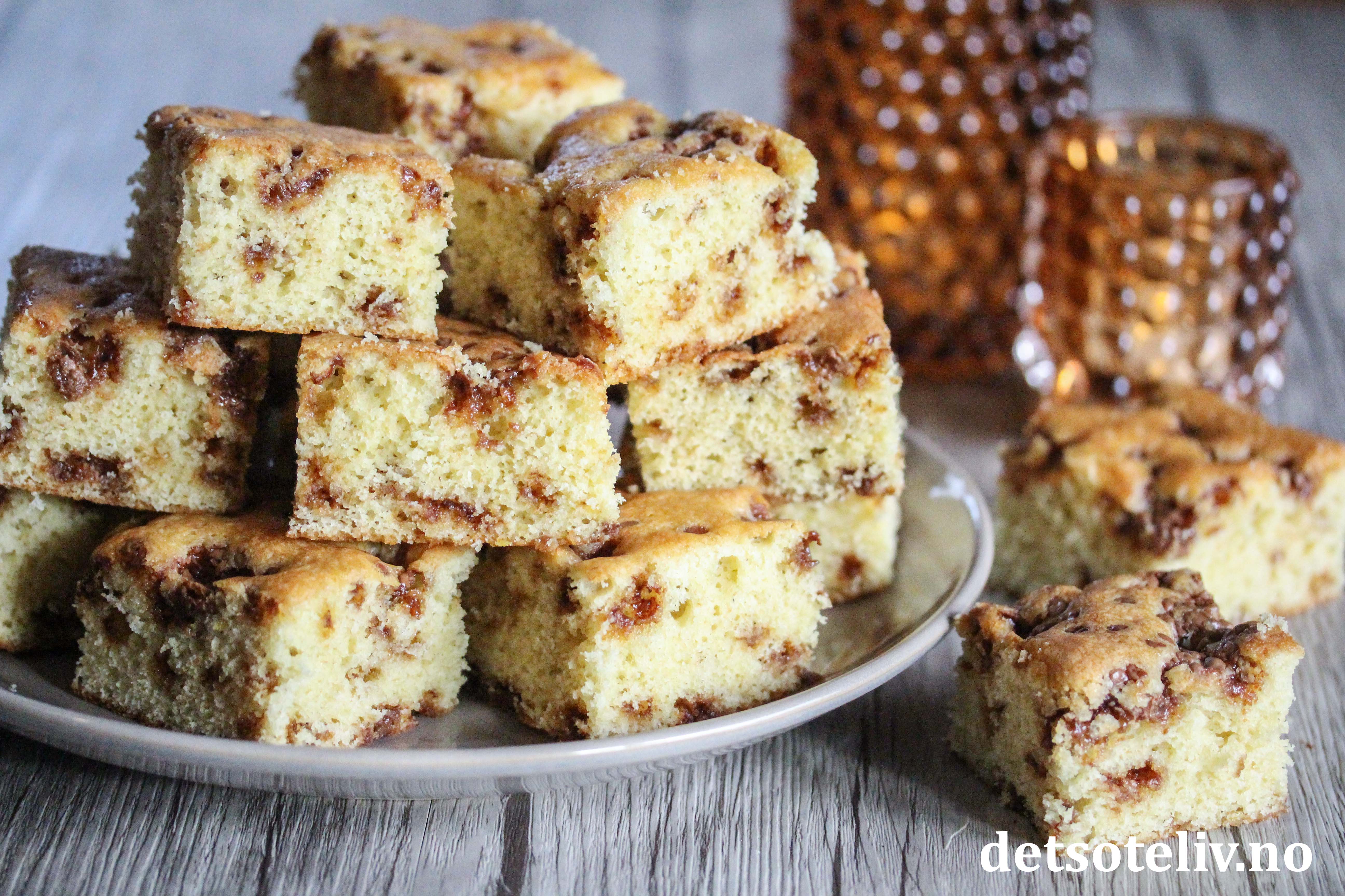 Her har du en enkel, men veldig god langpannekake som får et morsomt "flekkete" utseende på grunn av masse Daimkuler.