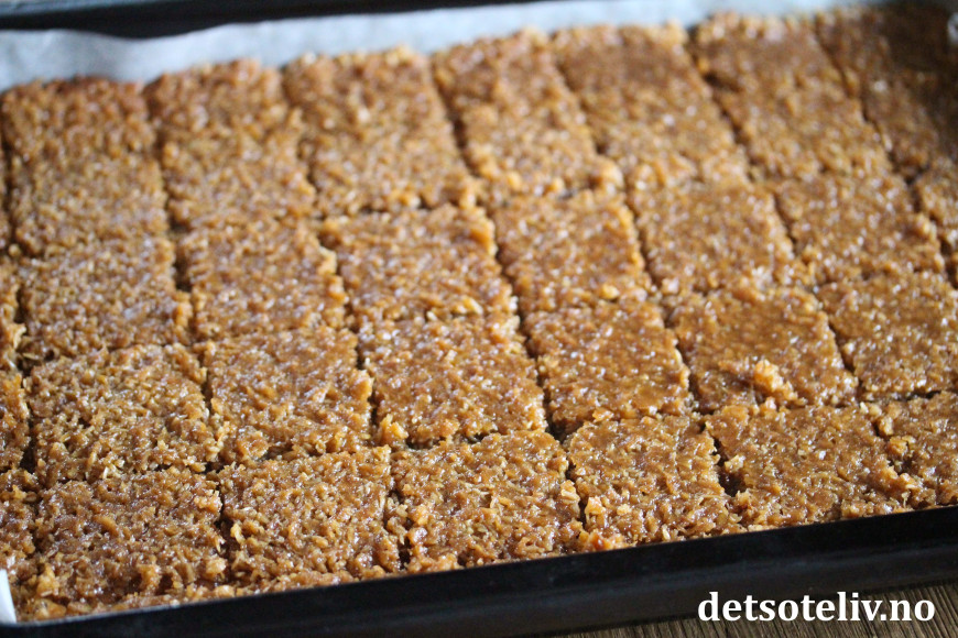 Bre deigen utover i en stor, bakepapirkledd langpanne (ca 30 x 40 cm). Stek kaken midt i ovnen ved 200°C i 20 minutter.
