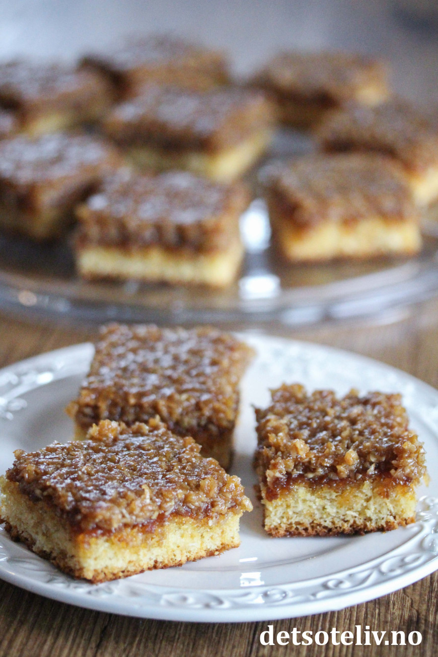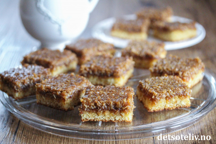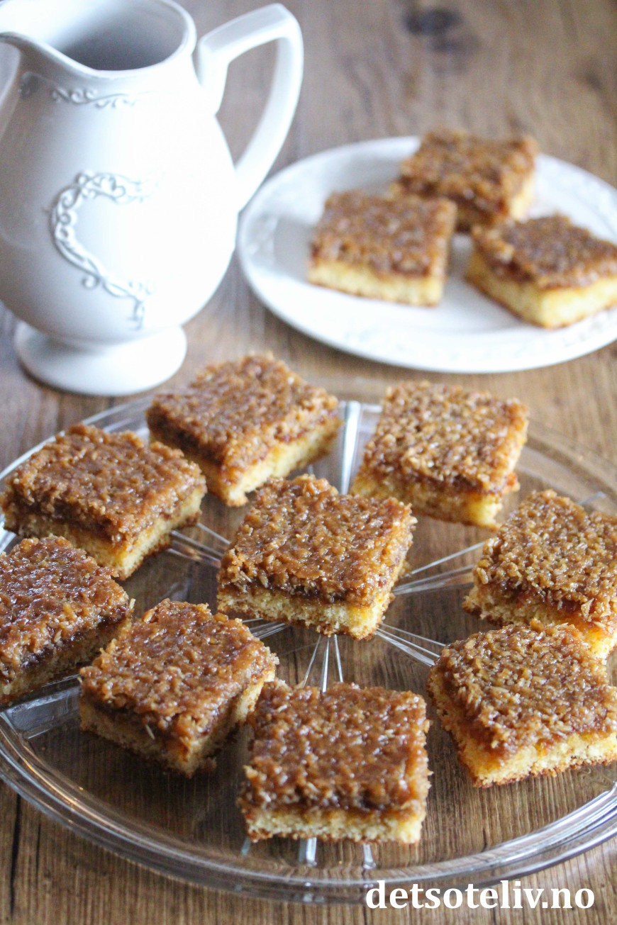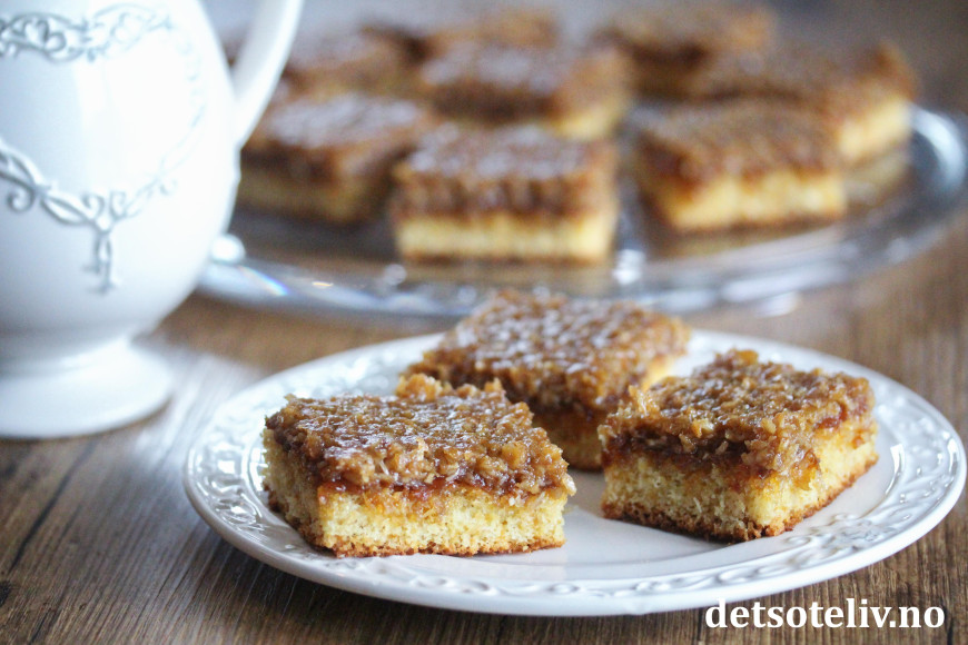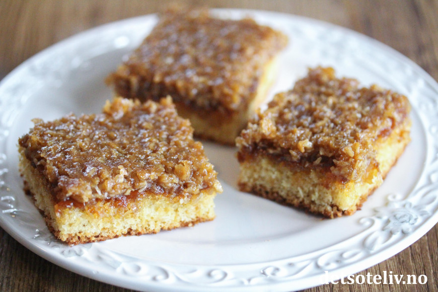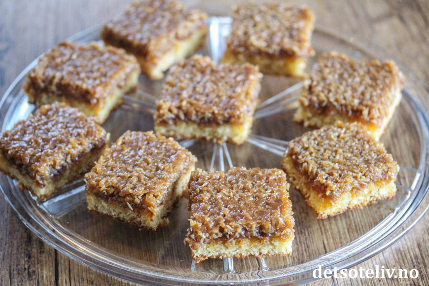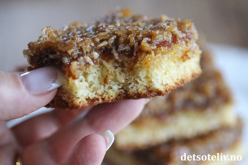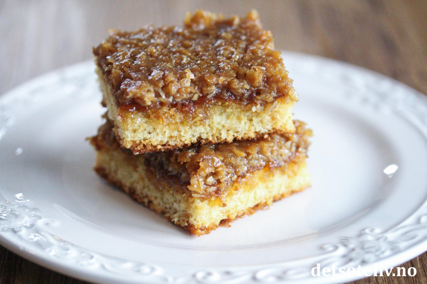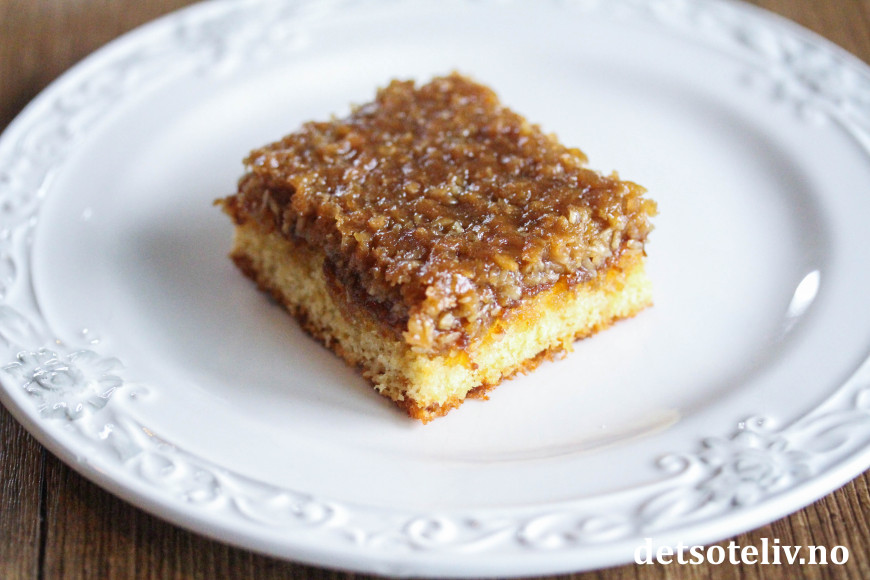 Stek kaken videre midt i ovnen ved 200°C i ca. 6-8 minutter. Kokosfyllet skal være boblende varmt når kaken tas ut av ovnen.