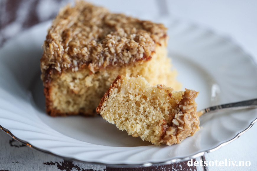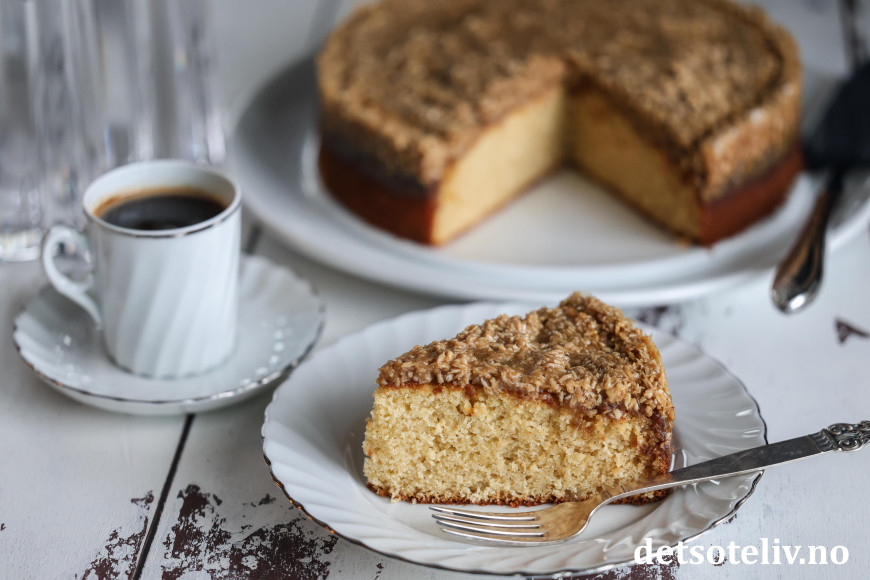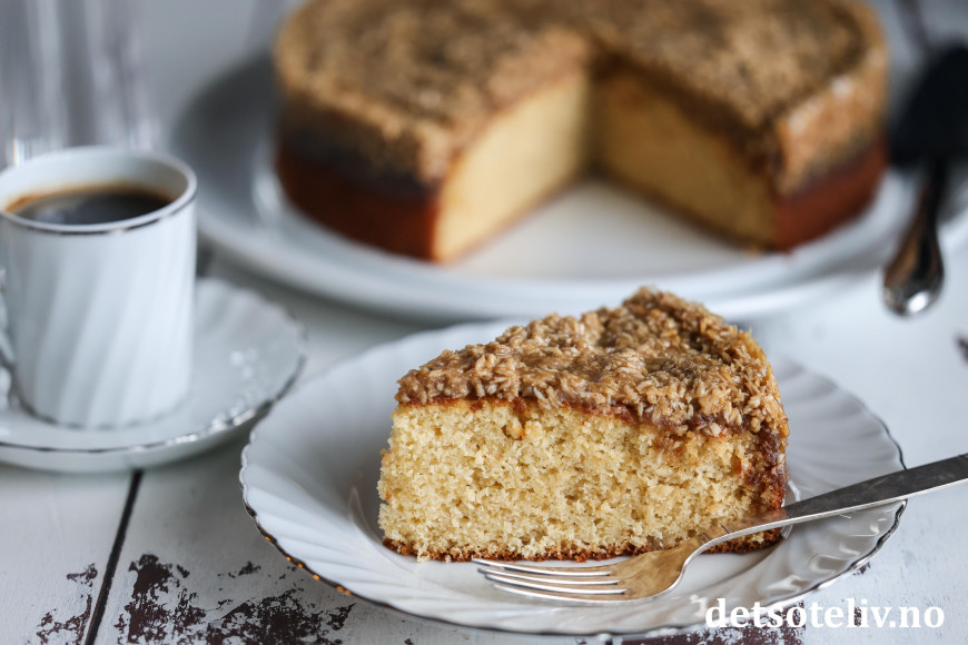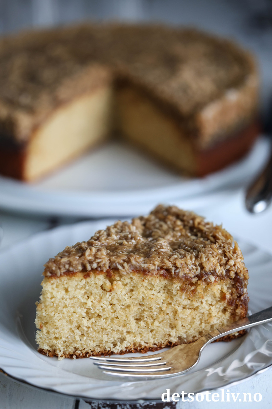 Dansk drømmekage ser nokså ordinær ut, men er kjempemyk og har den utrolig digge kokostoppingen!
