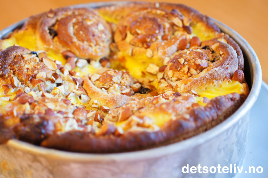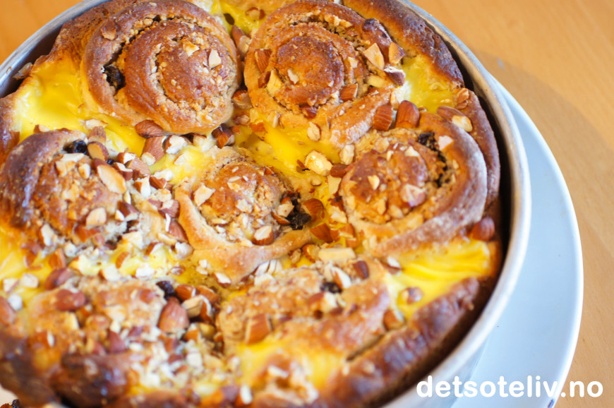 Kjevle ut den andre halvparten av deigen til et stort avlangt rektangel. Smør over nøttefyllet og dryss over rosiner. Rull sammen deigen fra langsiden til en fast rull. Skjær rullen i tykke skiver som legges utover bunnen av kaken (det skal være god avstand mellom rullene, for de kommer til å heve godt under stekingen). Fyll vaniljekrem i alle hullene mellom rullene oppå kaken og ha også litt vaniljekrem oppå hver rull. Strø over hakkede mandler. La kake stå og etterheve i 30 min.