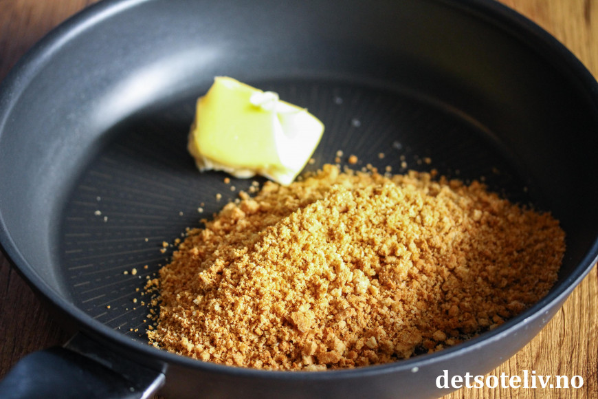 Knus kjeksen og ha smulene i en stekepanne. Tilsett smør og kanel. Stek kjekssmulene på middels varme til de blir gylne. Avkjøl.