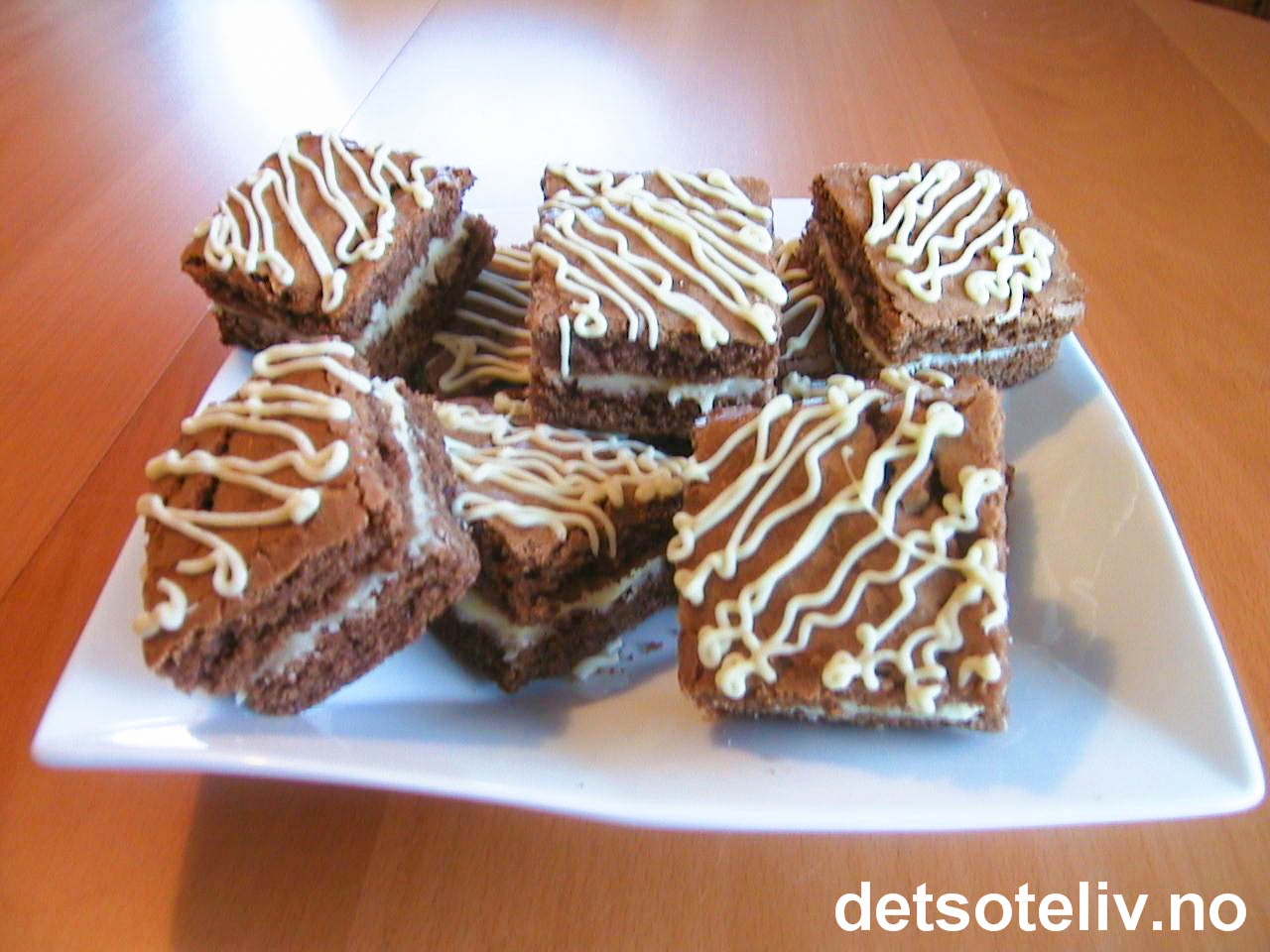 Del hver "Brownies" på midten og smør et tynt lag med hvit sjokoladekrem i mellom lagene. Press lagene godt sammen.