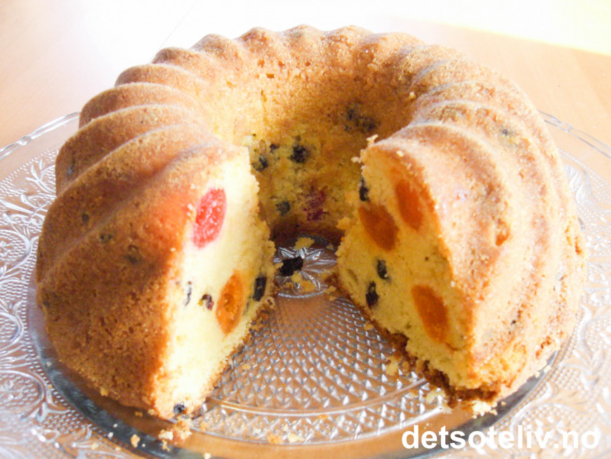 Pisk romtemperert smør og sukker til luftig smørkrem. Pisk inn ett egg om gangen. Rør inn 2 ss lake fra cocktailbærene. Sikt i bakepulver og nesten alt hvetemelet. Rør til du får en jevn og klumpfri deig. Bland resten av hvetemelet med korinter og avrente cocktailbær, slik at de blir lett dekket med mel (dette forhindrer at korintene og cocktailbærene synker til bunnen av kaken under stekingen). Ha dette så i deigen og rør lett sammen.