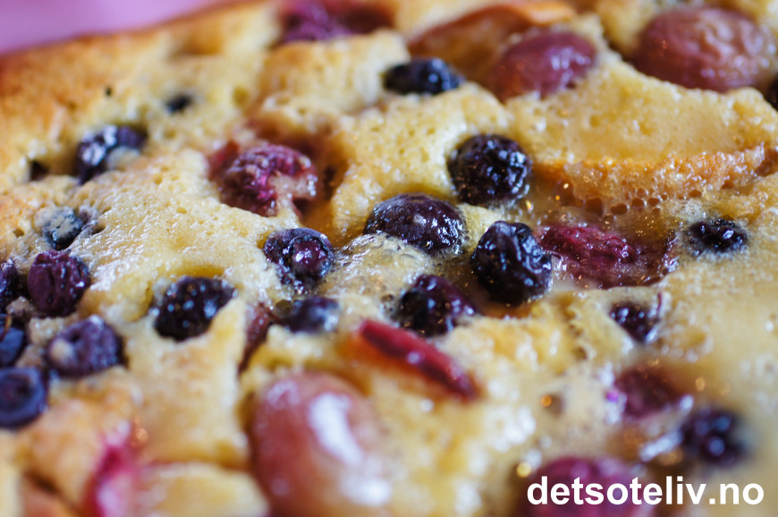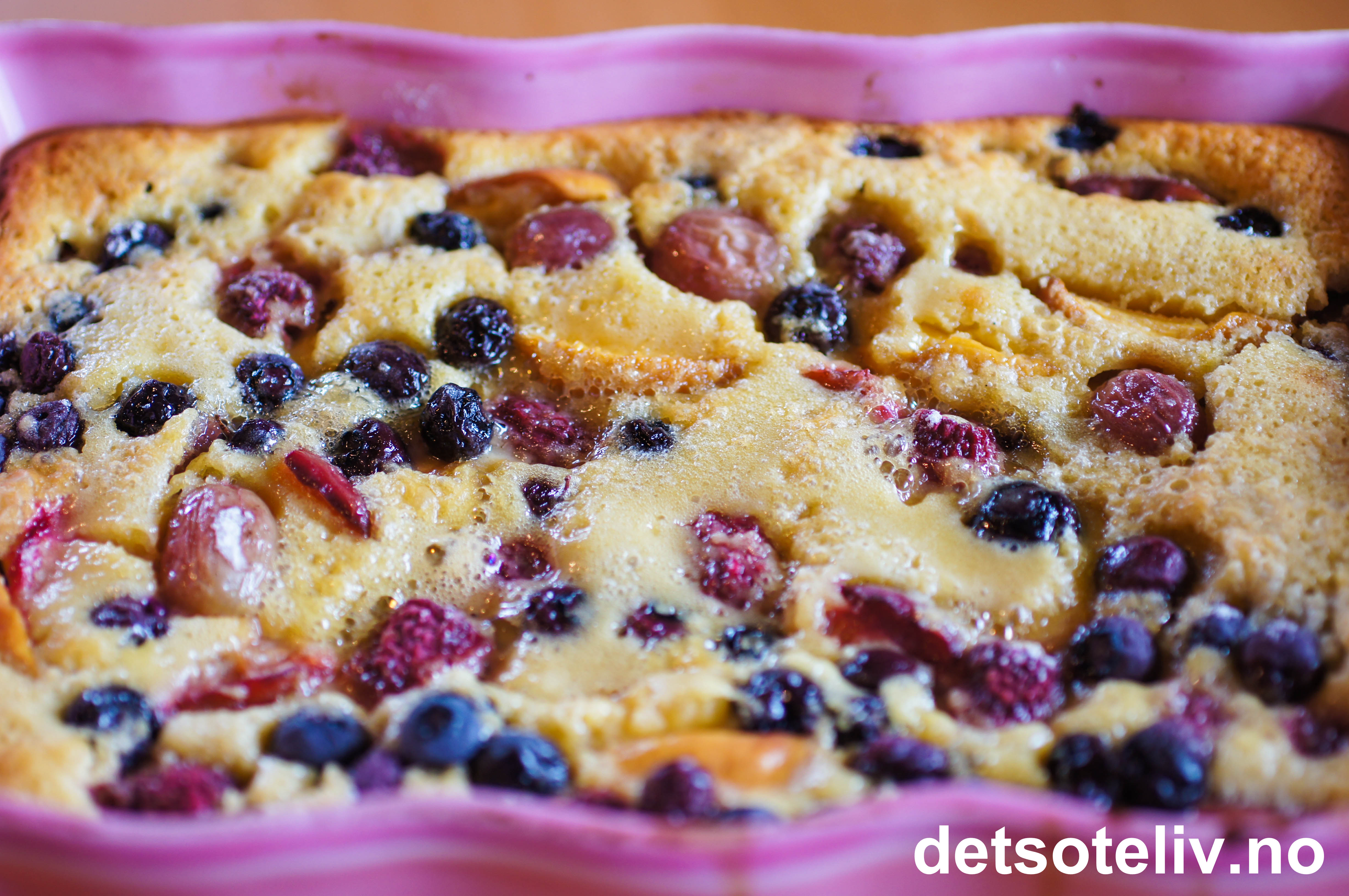 Pisk egg og sukker sammen med fløte og hvetemelet til en jevn deig. Hell røren over frukten i formen.
