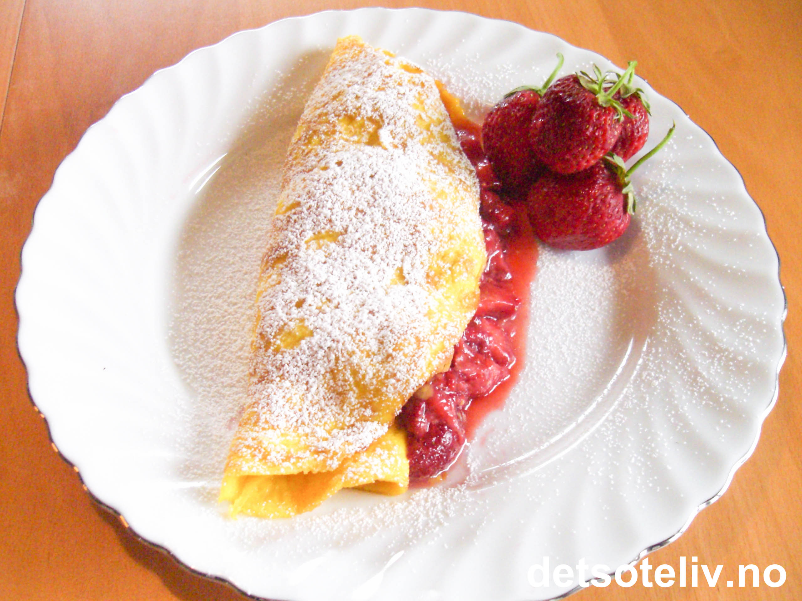 En "Dessertomelett med jordbær" er lett å lage og deilig sommermat!