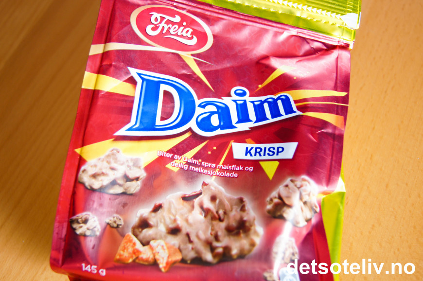 Daim Krisp er kjempegode sjokolader med Daim, sprø maisflak og melkesjokolade (fra Freia).