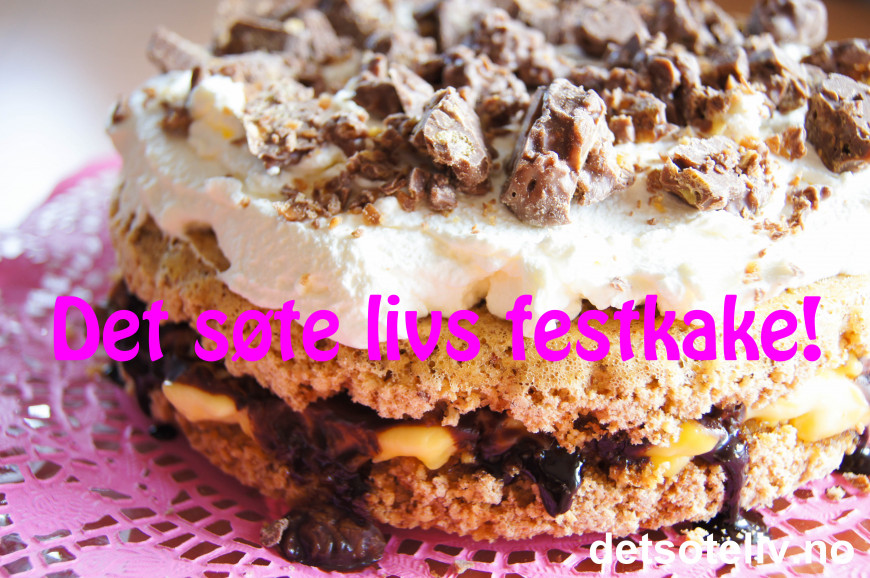 Dette er en kake som jeg har fått enormt mye skryt for! Kaken består av to myke mandelbunner som fylles med vaniljekrem, sjokoladesaus og hakkede Daim Krisp (du kan også bruke Smash Bites).