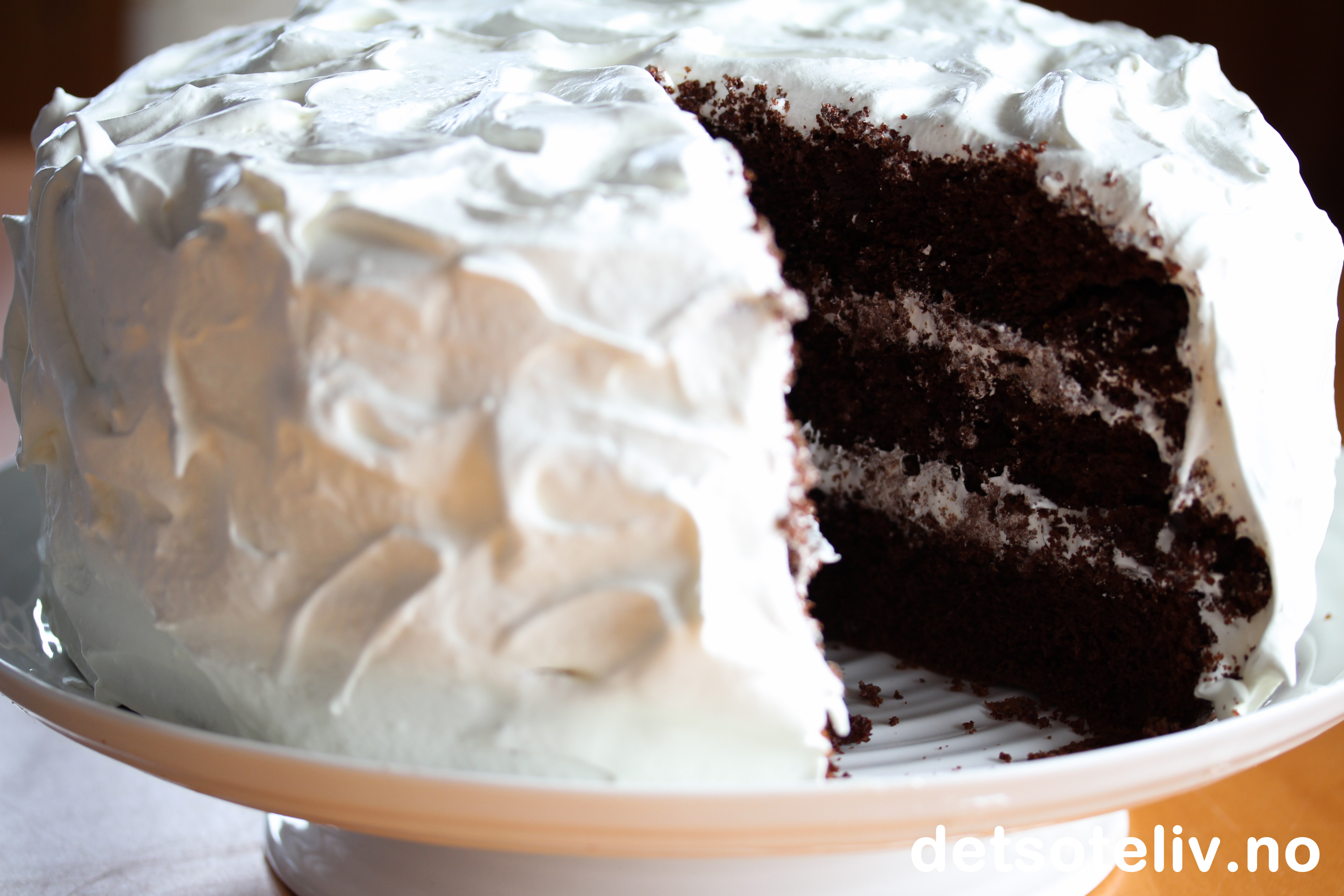 "Devil's Food Cake" er en amerikansk klassiker av storformat! Kaken er dekket med hvit og uskyldig marengskrem ("Angel Frosting"), men er svart som f... inni...