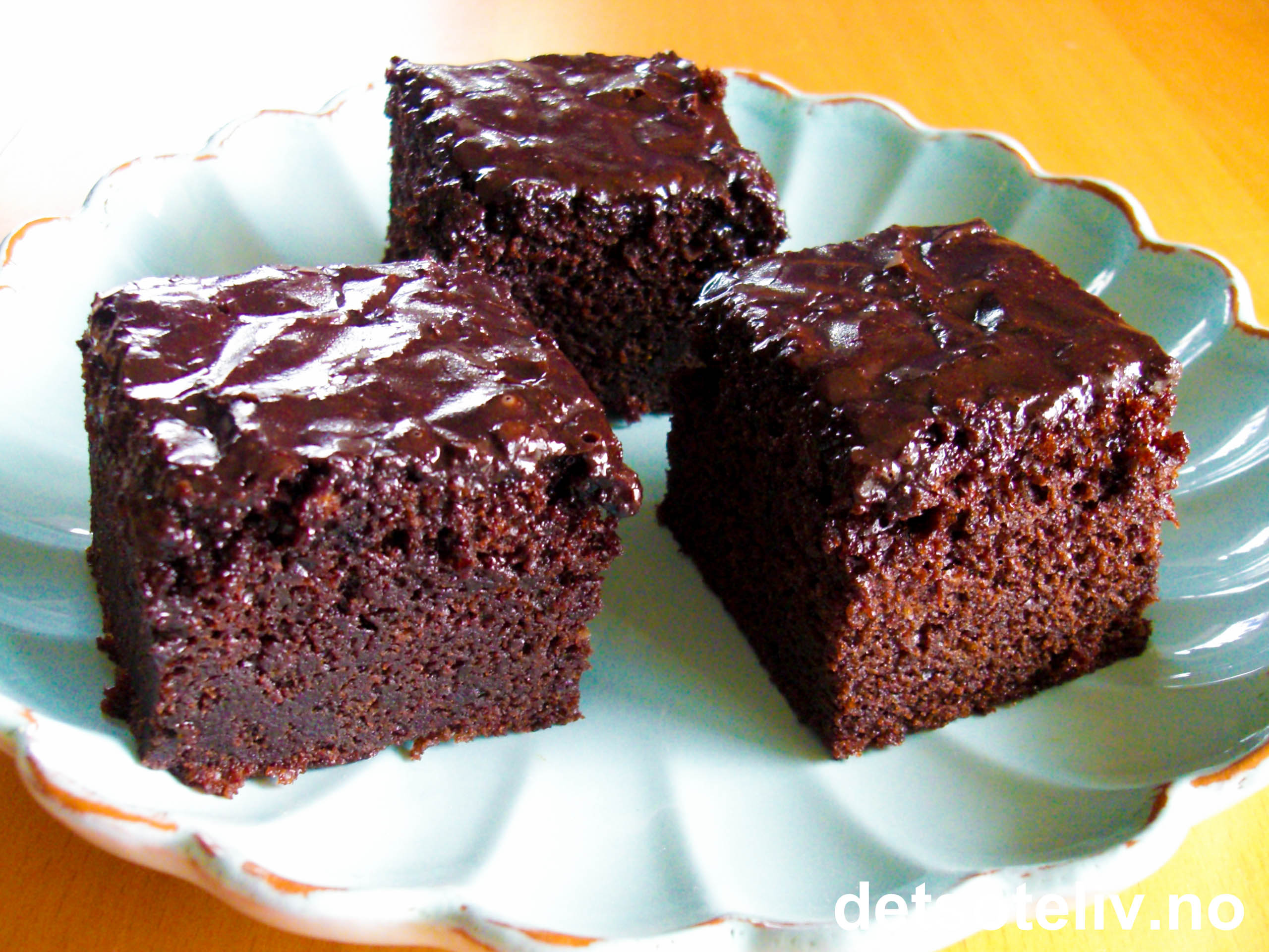 Hell deigen i en liten, bakepapirkledd langpanne (ca 20x30 cm). Stek kaken ved 175°C i 35-40 min (sjekk med kakenål).