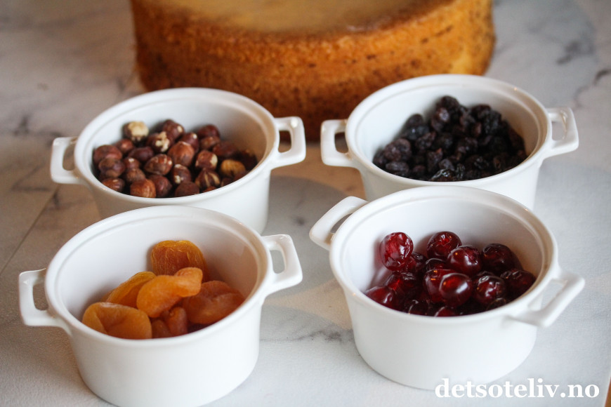 ♥ Jeg foreslår rosiner, aprikoser, hasselnøtter og cocktailbær som en veldig god kombinasjon, men bytt ut som du ønsker og med det du har tilgjengelig av tørket frukt og nøtter. Bruk gjerne større mengder enn det jeg har angitt i oppskriften hvis du vil.