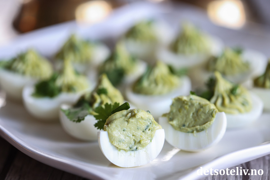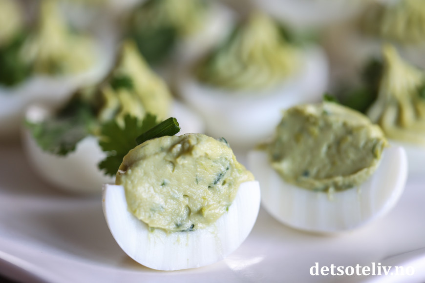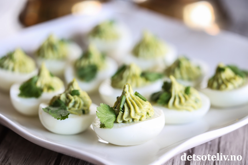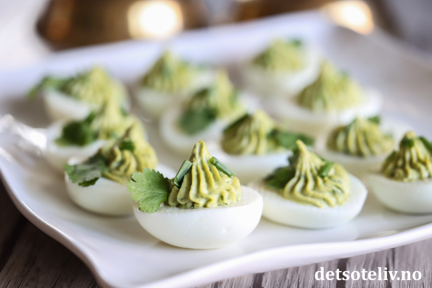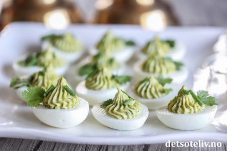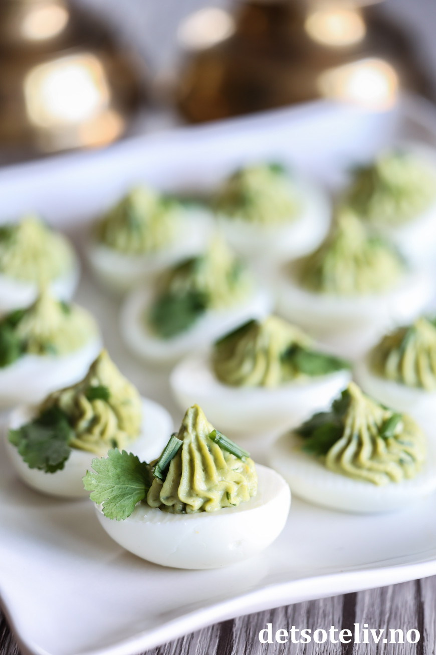 Her har jeg laget en grønn variant som inneholder avokado i fyllet. Finhakket jalapeño gjør at også disse eggene blir spicy og djevelsk gode... 😉