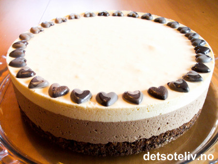 Ta kaken ut av fryseren i ca 20 minutter før servering. Pynt med sjokoladehjerter eller annen sjokoladedekor.