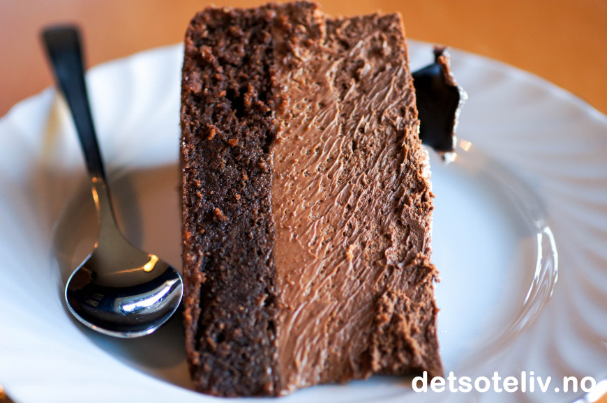Kaken består av deilig sjokoladebunn som dekkes med et lag lys melkesjokolademousse og så et lag mørk sjokolademousse.
