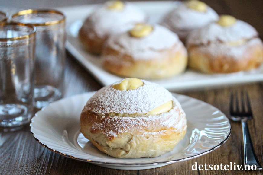 Fyll hullet helt opp til toppen med RIKELIGE mengder vaniljekrem (bruk to spiseskjeer). Skjær ut et lite, rundt hull i midten på hvert bollelokk. Legg lokkene på bollene og klem godt inntil bollene, slik at vaniljekremen tyter litt ut av hullet på toppen. Legg deretter en liten ekstra klatt med vaniljekrem oppi hullet på toppen (bruk to teskjeer).