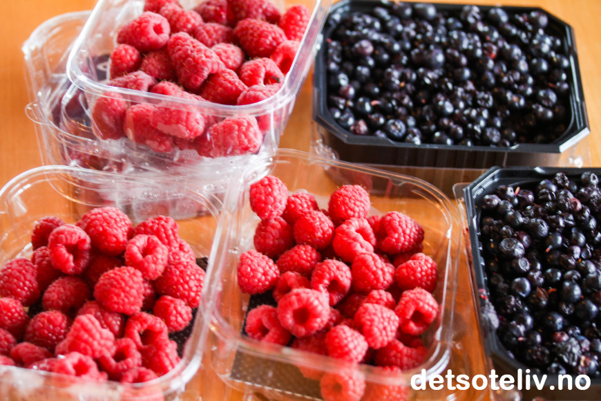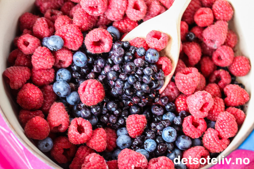♥ Jeg har her brukt litt mer bringebær enn blåbær, men det går like fint å bruke lik mengde av begge typer bær. Bruk helst norsk villblåbær for ekstra god smak!