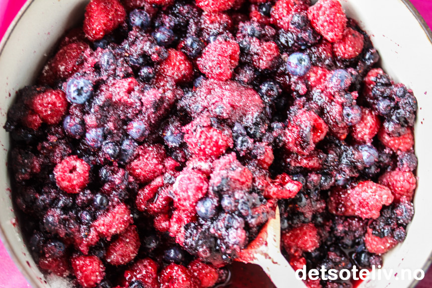 La blandingen gjerne stå i kjøleskapet i et par timer så bærene begynner å safte seg.