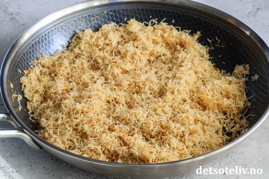Stek deigstrimlene på middels varme slik at de blir gyllenbrune og sprø. Vend rundt på deigen mens den steker slik at den ikke svir seg.