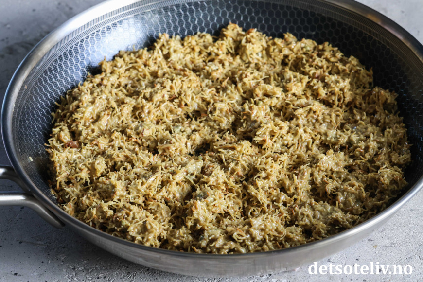 Finn frem kadayif. Vei opp mengden du trenger, skjær deigen i mindre biter og ha deigen i en stekepanne med smeltet smør. (Jeg lagde her pistasjfyll til både Dubai sjokoladecookies og Dubai Chocolate Chip Cookies). Stek deigstrimlene på middels varme slik at de blir gyllenbrune og sprø. Vend rundt på deigen mens den steker slik at den ikke svir seg.