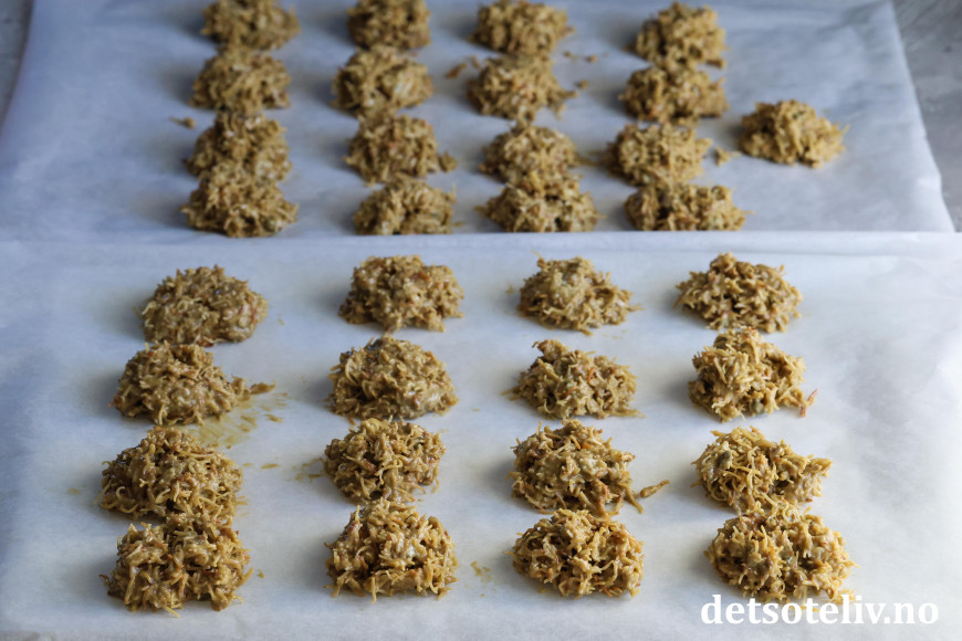 Finn frem en fjøl som du dekker med bakepapir. Form 16 teskjestore topper (jeg lagde som sagt større porsjon fordi jeg også lagde pistasjfyll til Dubai Chocolate Chip Cookies og formet til sammen litt over 30 topper).