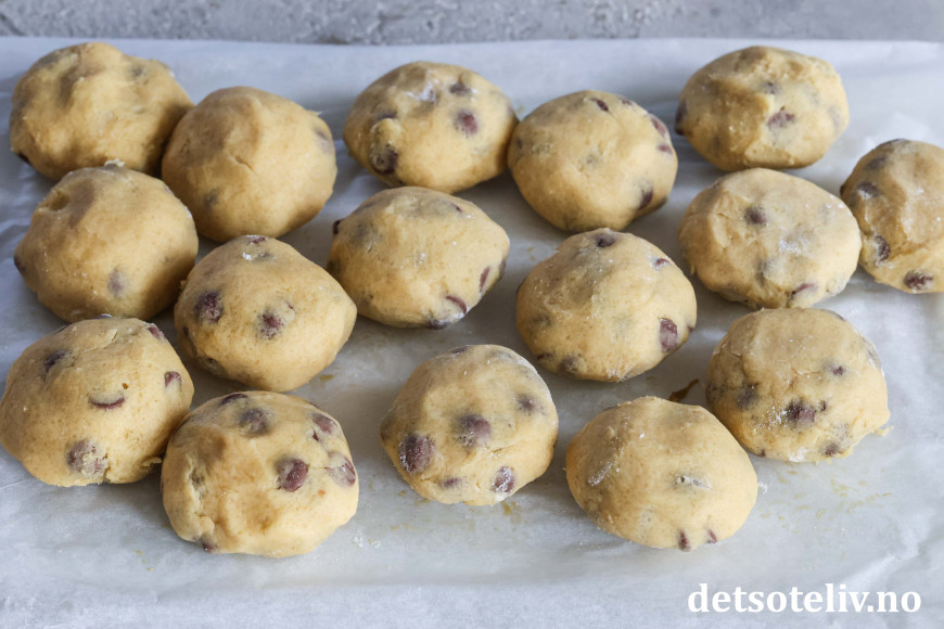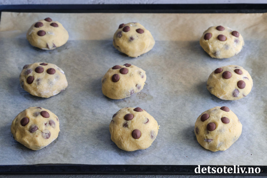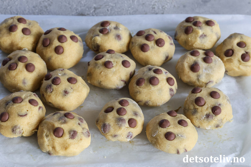 Del deigen i 16 jevnstore deler (ca. 60 gram deig per kake). Klem deigen litt flat mellom hendene og legg på en fryst pistasjtopp. Klem deigen rundt pistasjtoppen og pass på at deigen er tett rundt fyllet. Klem ned noen få melkesjokoladeknapper på toppen av kaken.