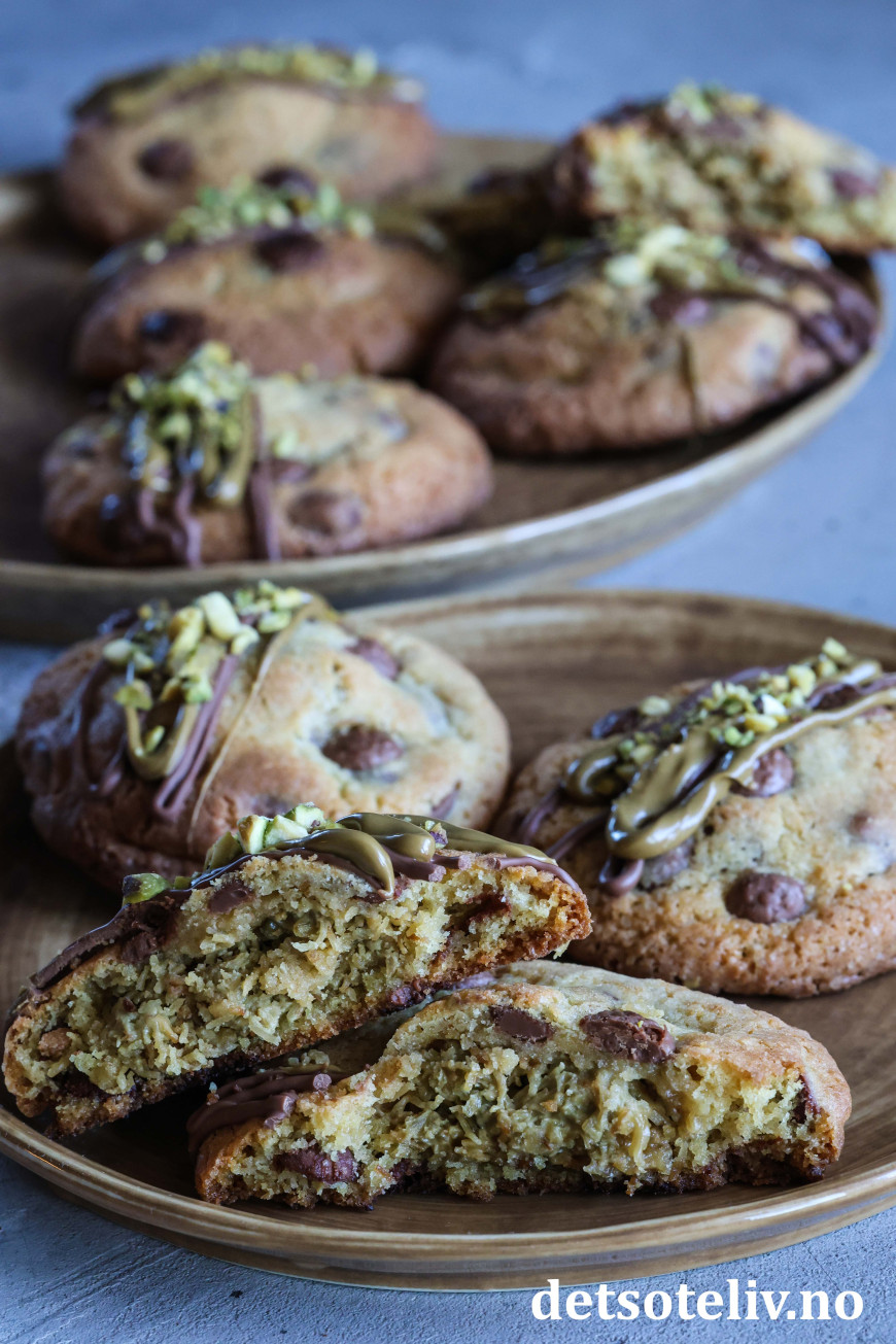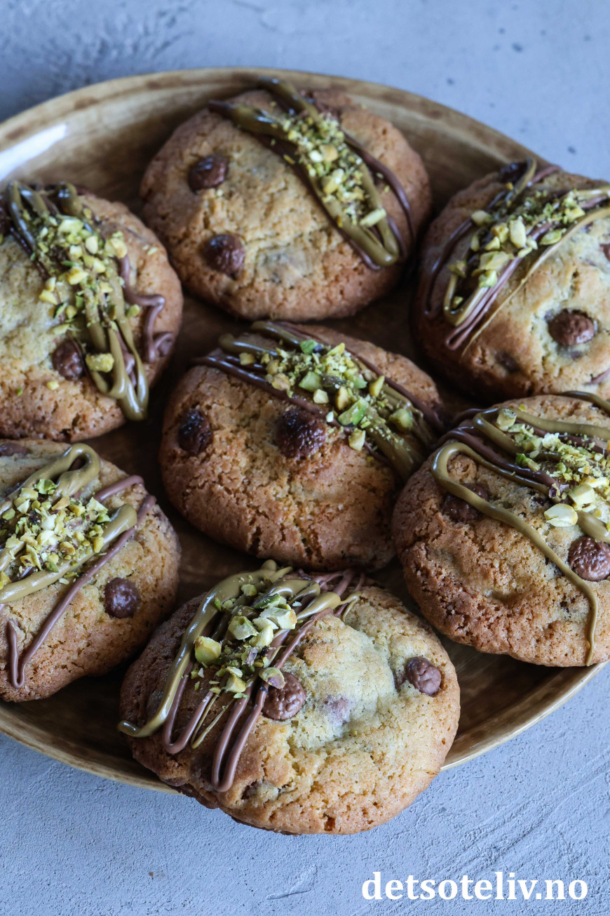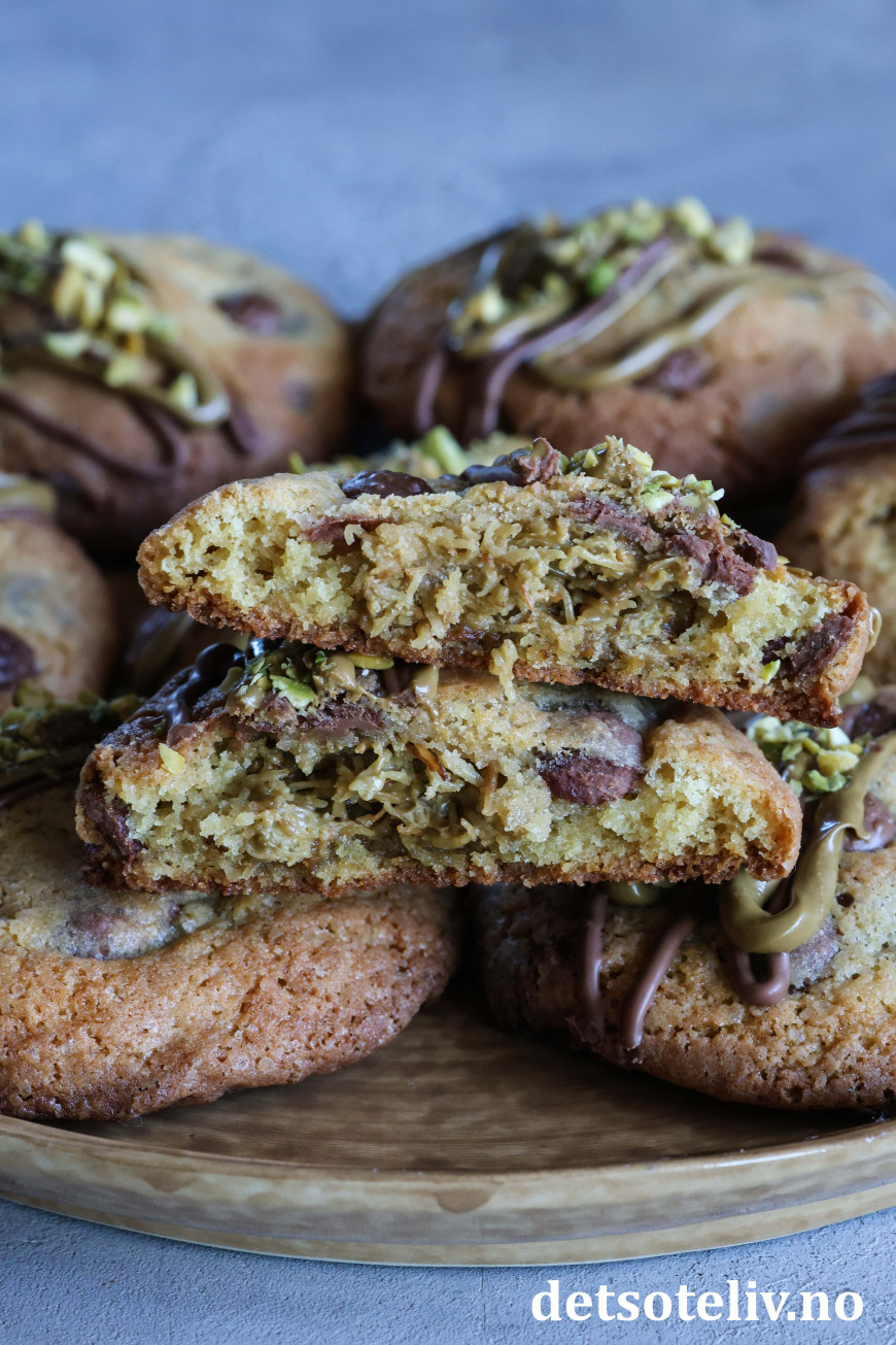 Inspirert av den populære Dubai-sjokoladen, har du her noen kjempegode cookies som er fylt med det samme, karakteristiske pistasjfyllet. Pistasjkrem blandes med sprøstekt kadayif (også kalt kataifi), som er supertynn, finstrimlet filodeig. Dette gir en helt spesiell og knasende konsistens på pistasjfyllet.