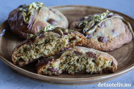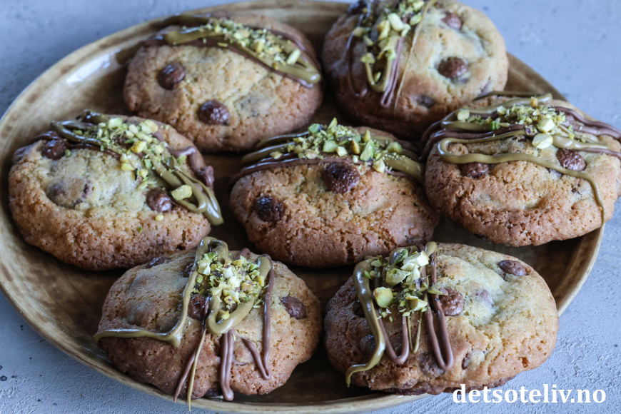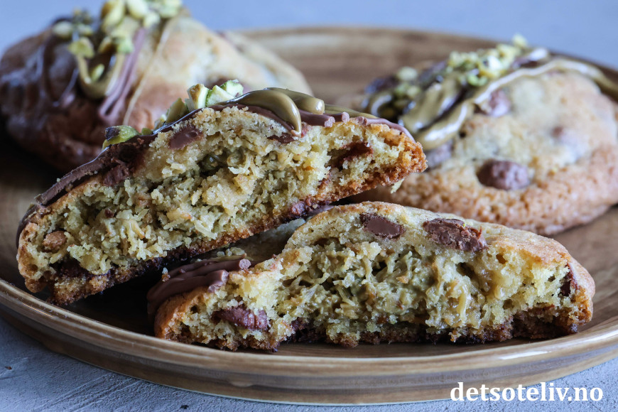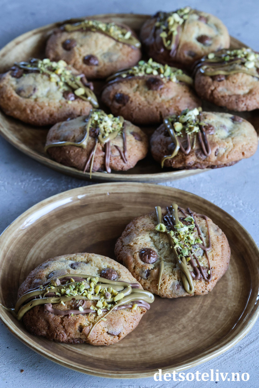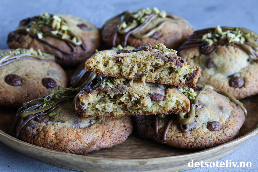 Inspirert av den populære Dubai-sjokoladen, har du her noen kjempegode cookies som er fylt med det samme, karakteristiske pistasjfyllet. Pistasjkrem blandes med sprøstekt kadayif (også kalt kataifi), som er supertynn, finstrimlet filodeig. Dette gir en helt spesiell og knasende konsistens på pistasjfyllet.