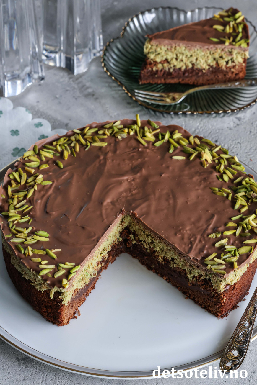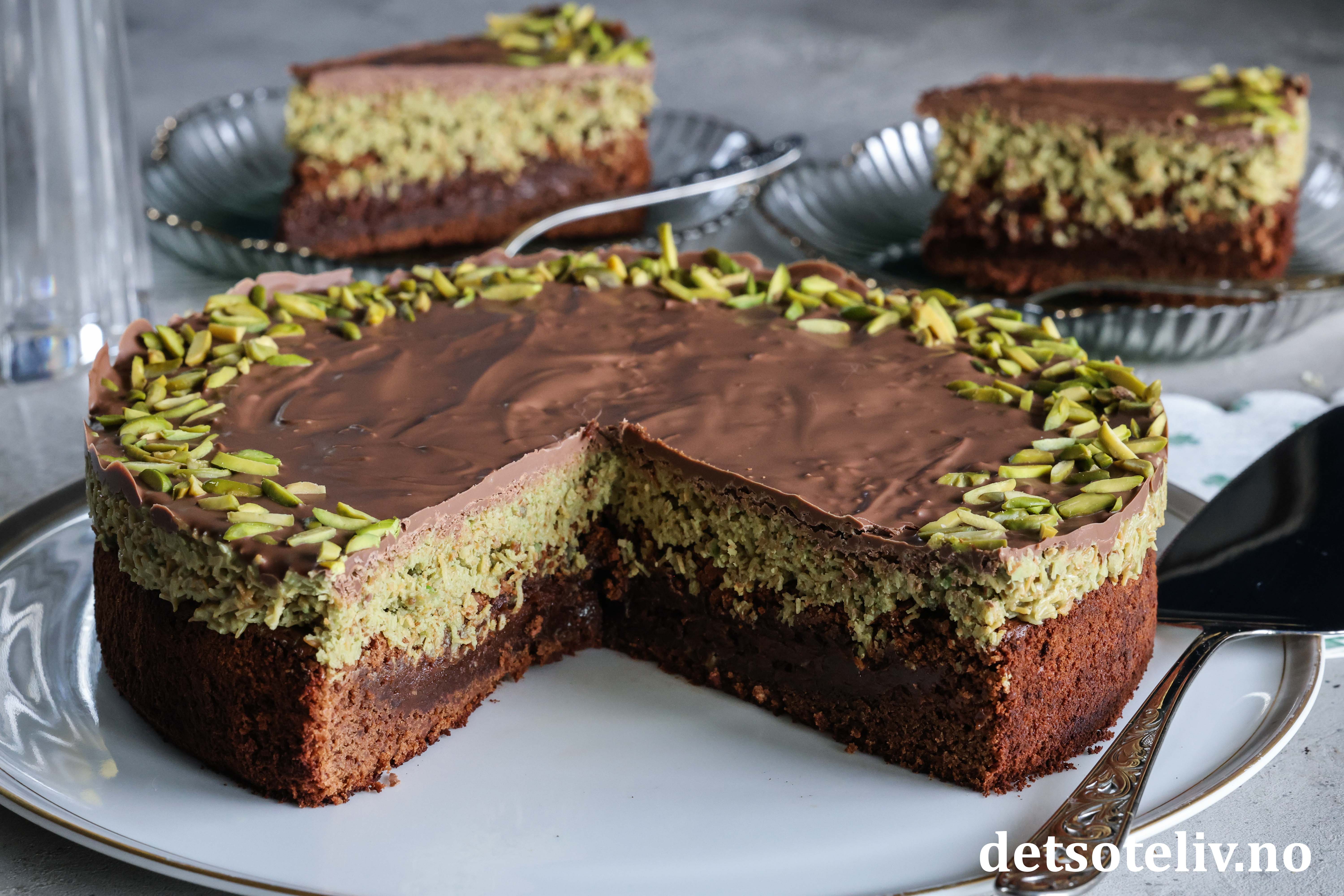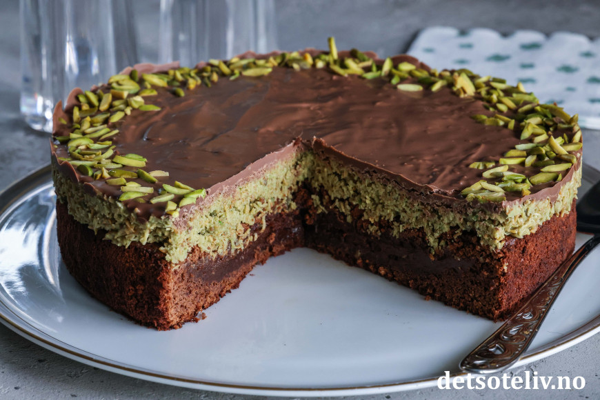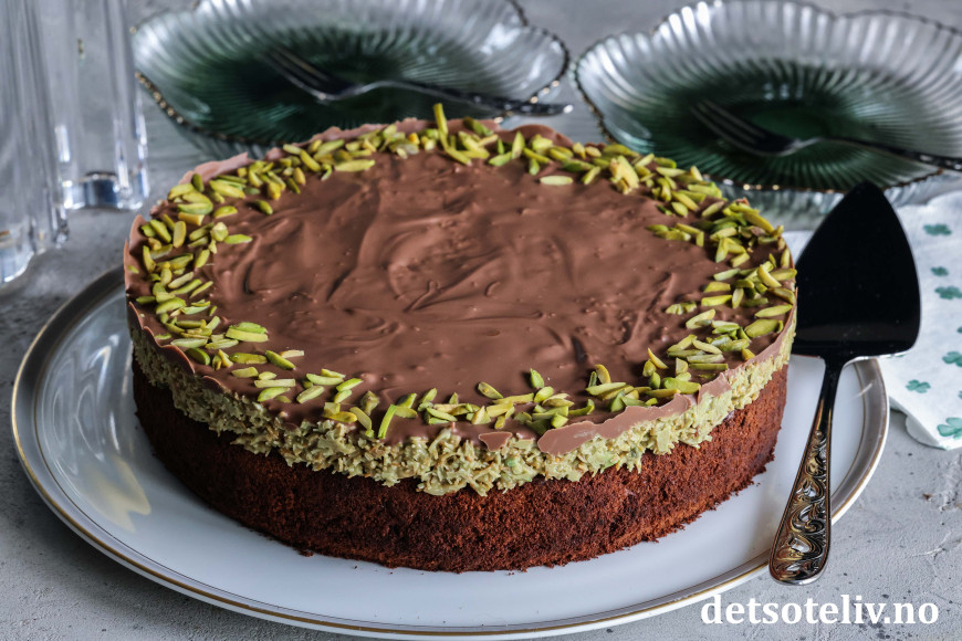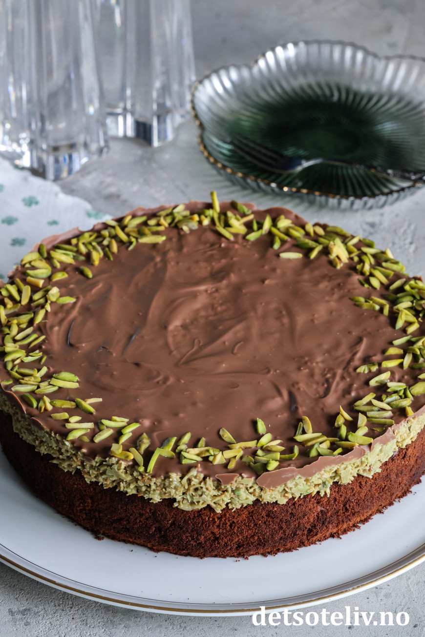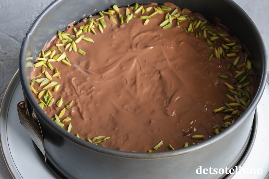 Fordel den smeltede sjokoladen over pistasjtoppingen. Pynt med hakkede pistasjnøtter. Sett kaken i kjøleskapet i minst 1 time slik at sjokoladeglasuren har stivnet før du fjerner kakeringen.