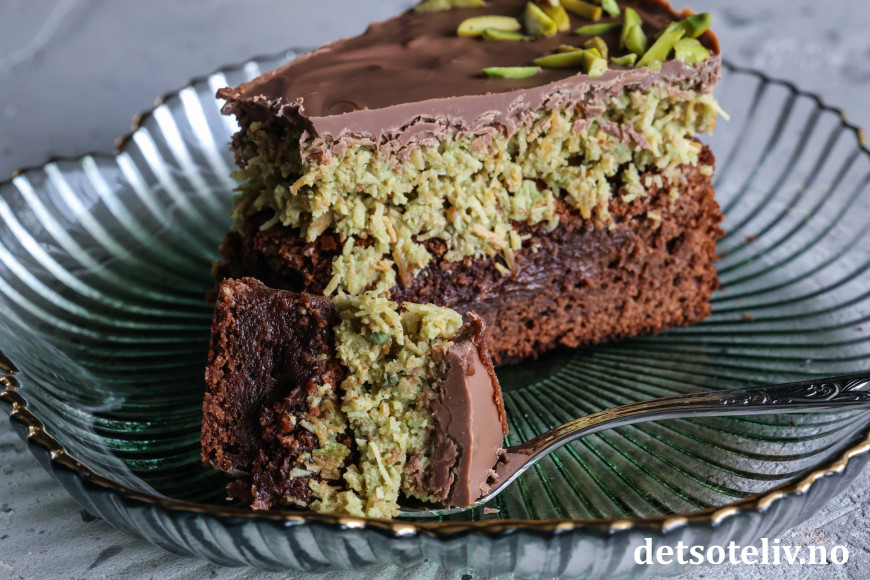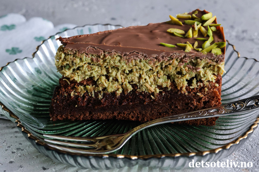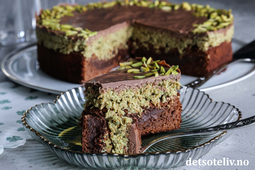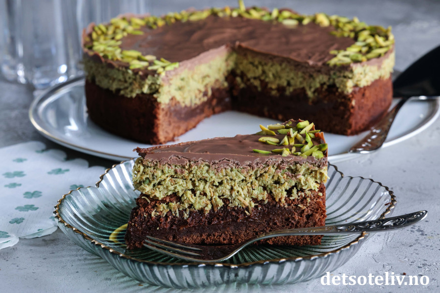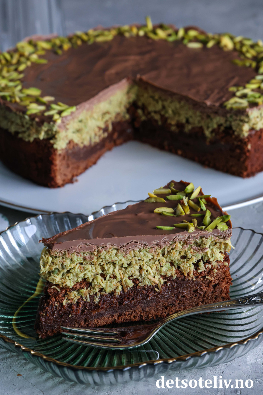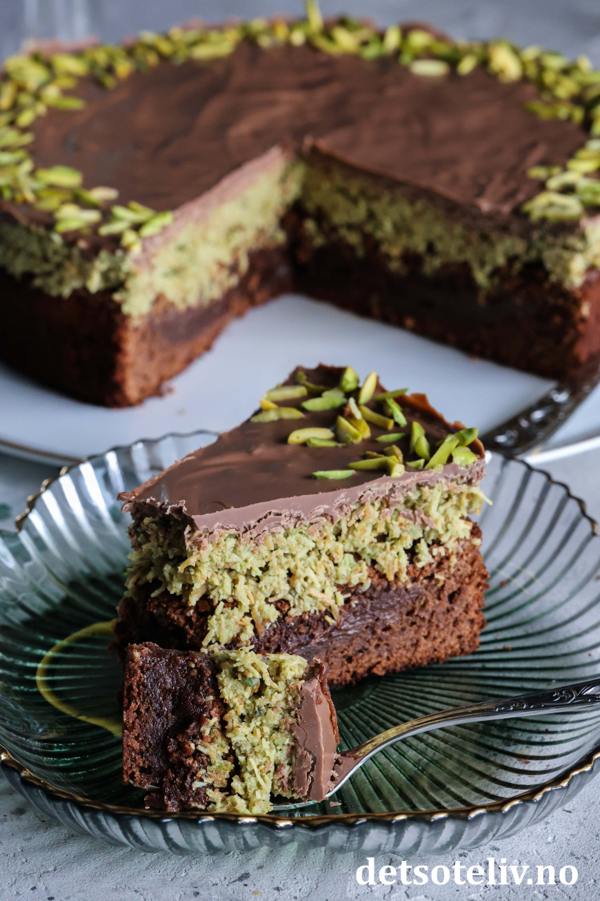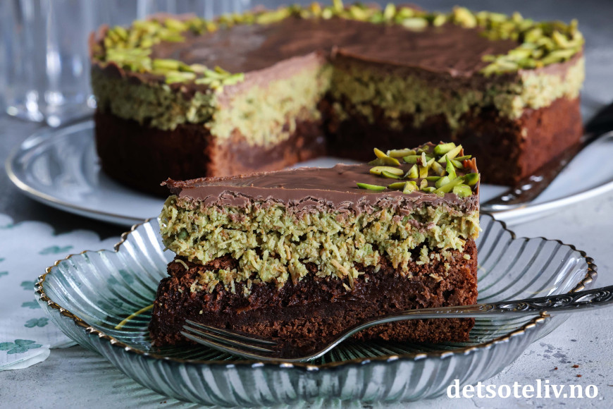 Fordel den smeltede sjokoladen over pistasjtoppingen. Pynt med hakkede pistasjnøtter. Sett kaken i kjøleskapet i minst 1 time slik at sjokoladeglasuren har stivnet før du fjerner kakeringen.