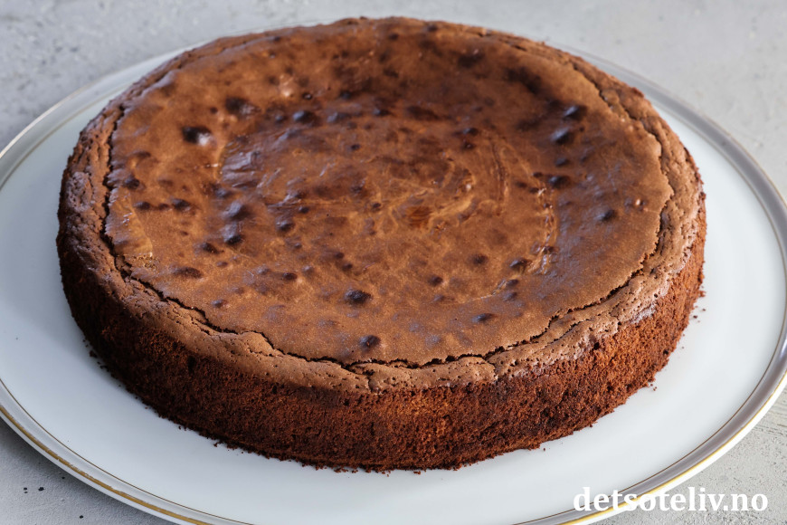 ♥ Vær ekstremt nøye med steketiden på denne kaken. Hvis den stekes for lite blir den for rå, og stekes den noen minutter for mye forsvinner den fuktige midtdelen som denne kaken skal ha. Selv om kaken ikke virker ferdig stekt når den tas ut av ovnen, vil den festne seg i løpet av natten den står i kjøleskapet.