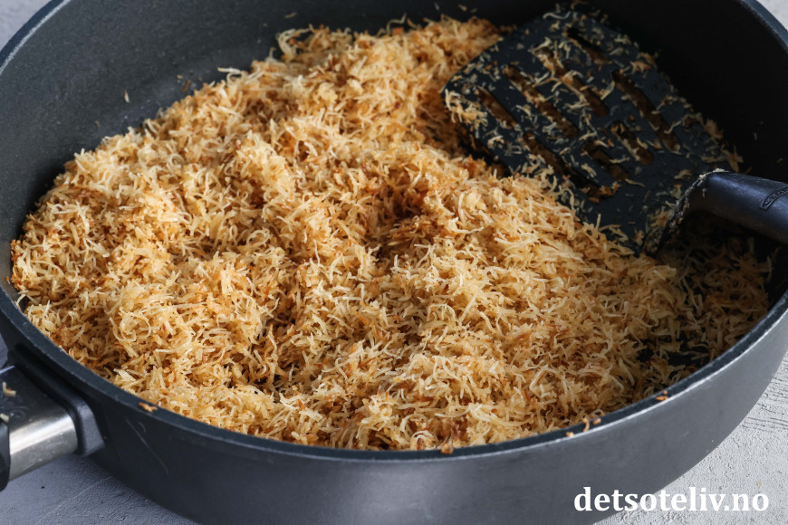 Finn frem kadayif. Vei opp mengden du trenger, skjær deigen i mindre biter og ha deigen i en stekepanne med smeltet smør. Stek deigstrimlene på middels varme slik at de blir gyllenbrune og sprø. Vend rundt på deigen mens den steker slik at den ikke svir seg.