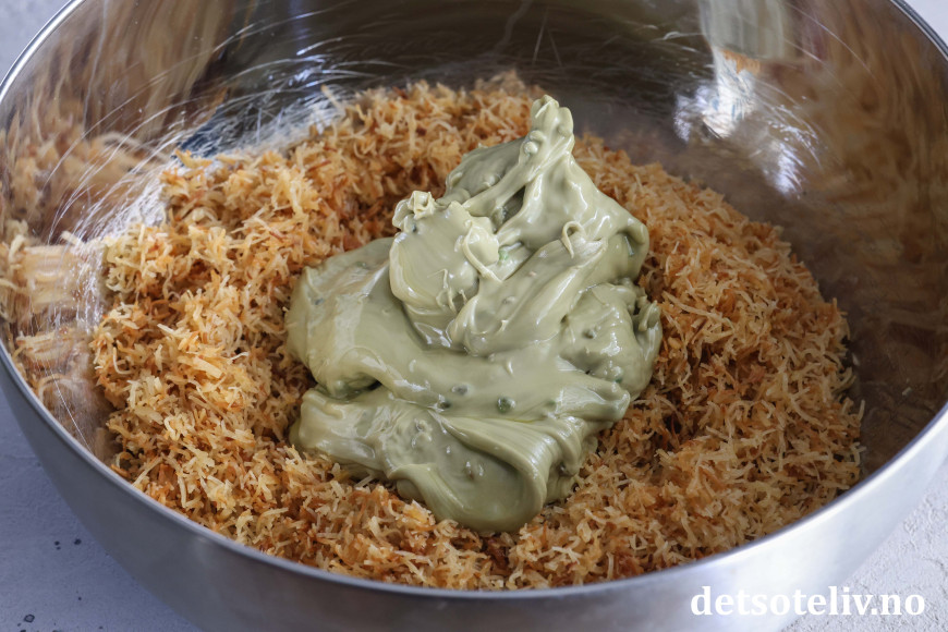 Ha den stekte kadayif over i en bolle. Bland inn pistasjkremen (den kan gjerne varmes kort i mikrobølgeovnene først, så den er litt mer tyntflytende). Bland eventuelt inn en liten dråpe grønn konditorfarge for å få sterkere grønnfarge.