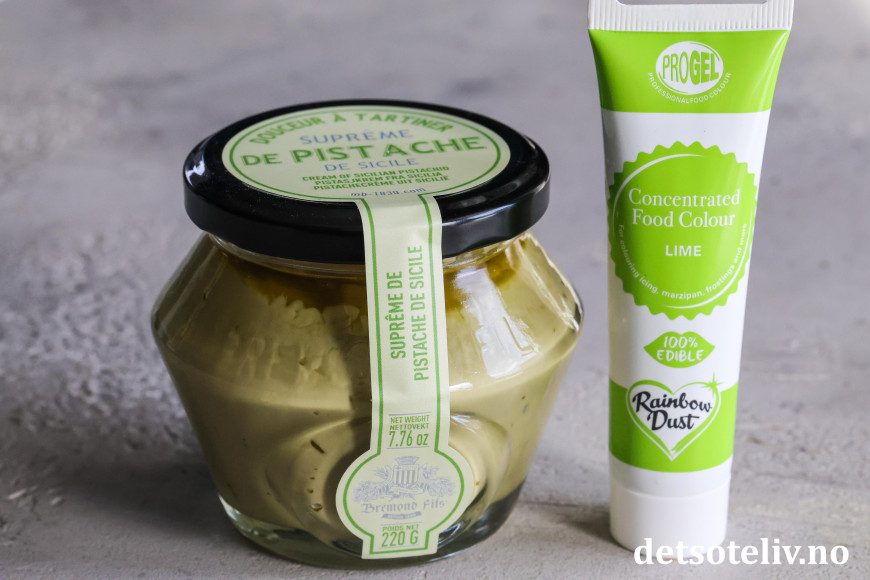 ♥ Grønn konditorfarge gir litt friskere grønnfarge på pistasjtoppingen. Dette fås kjøpt i kjøkkenutstyrsbutikker og nettbutikker som selger kakeutstyr. Jeg brukte fargen "Lime" fra Progel.
