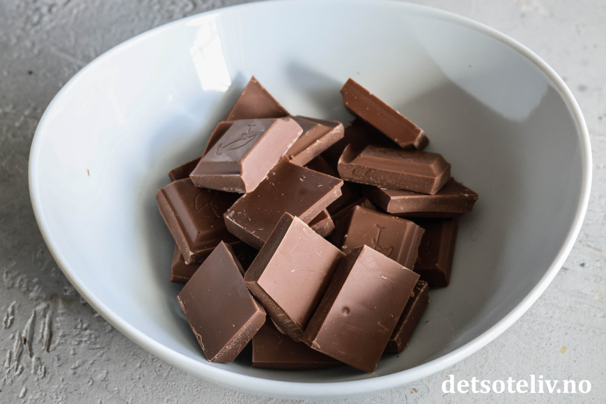 Smelt melkesjokoladen (gjøres raskt i mikrobølgeovnene eller i en bolle over vannbad).