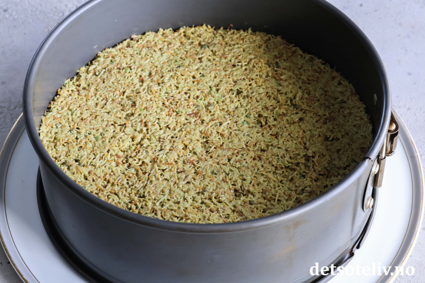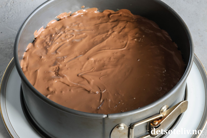 Ha deigen i en rund form (24 cm i diameter) med bakepapir i bunnen.
