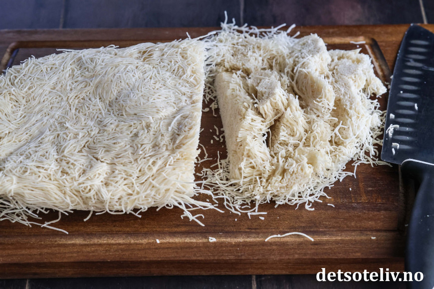 ♥ Kadayif (også kalt kataifi) er supertynn, finstrimlet filodeig. Produktet fås foreløpig ikke kjøpt i vanlige norske matbutikker, men i mange utenlandske matbutikker (se i kjøledisken eller i fryseren). Jeg har kjøpt dette i matbutikker på Grønland i Oslo. Kadayif har flere måneders holdbarhet i kjøleskapet.