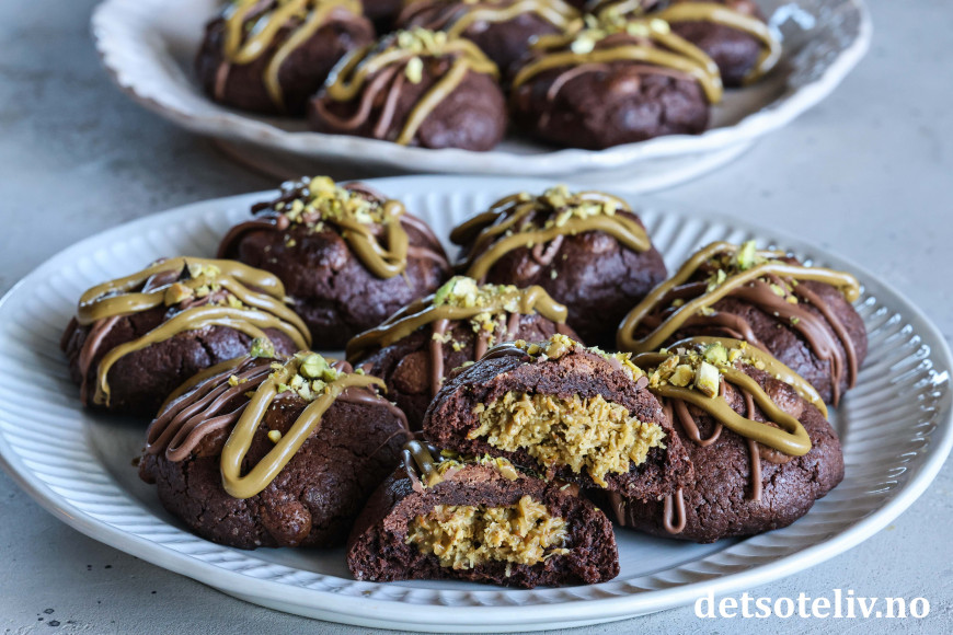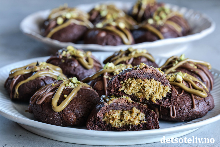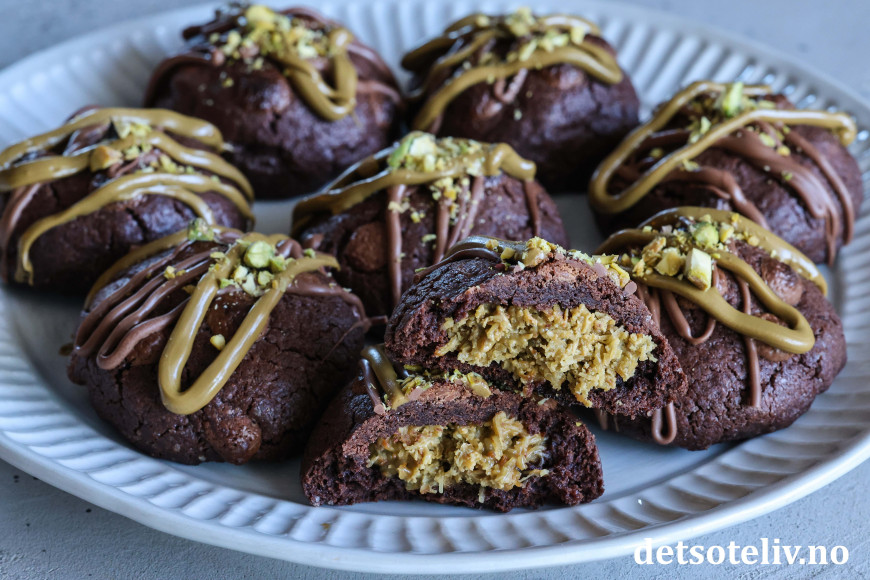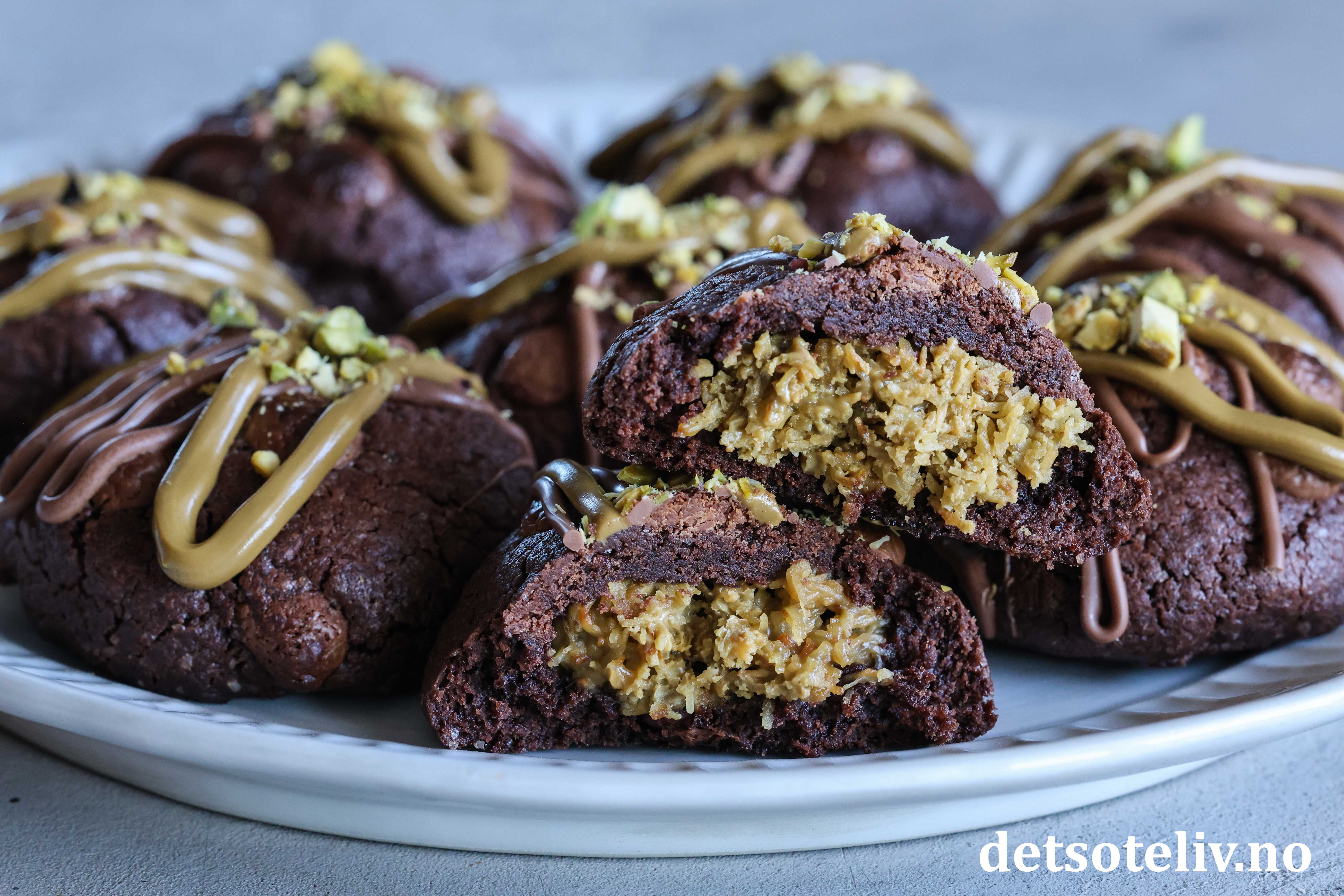 Her har du superpopulære sjokoladecookies (Dubai Chocolate Cookies), som fylles med den karakteristiske pistasjkremen som Dubai-sjokoladen er kjent for. Pistasjkremen blandes med sprøstekt kadayif (også kalt kataifi), som er supertynn, finstrimlet filodeig.