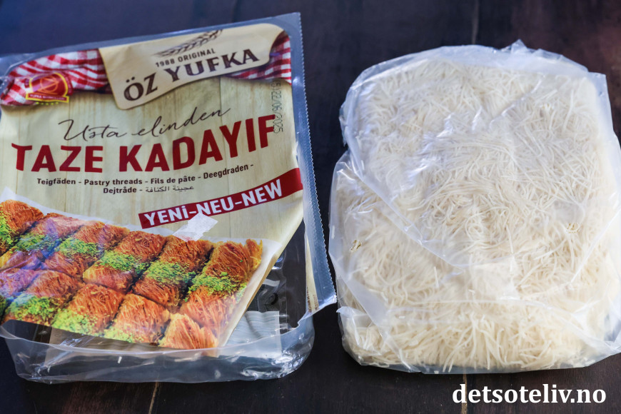 ♥ Kadayif fås foreløpig ikke kjøpt i vanlige norske matbutikker, men i mange utenlandske matbutikker (se i kjøledisken eller i fryseren). Jeg har kjøpt dette i matbutikker på Grønland i Oslo. Kadayif har flere måneders holdbarhet i kjøleskapet.