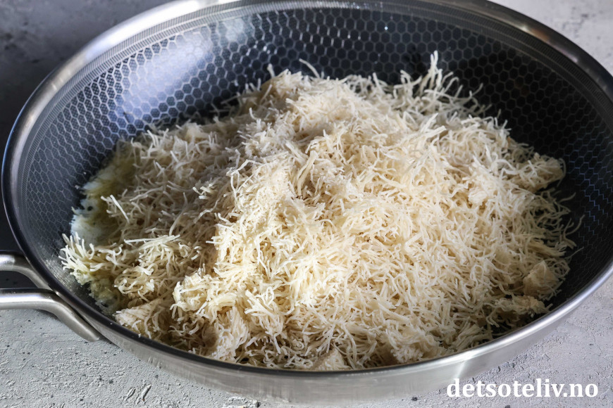 Finn frem kadayif. Vei opp mengden du trenger, skjær deigen i mindre biter og ha deigen i en stekepanne med smeltet smør. (Jeg lagde her pistasjfyll til både Dubai sjokoladecookies og Dubai Chocolate Chip Cookies). Stek deigstrimlene på middels varme slik at de blir gyllenbrune og sprø. Vend rundt på deigen mens den steker slik at den ikke svir seg.