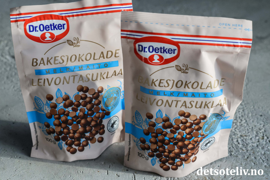 ♥ Jeg brukte melkesjokoladeknapper fra Dr Oetker. Du kan fint bruke melkesjokoladeknapper fra andre merker, eller så kan du bruke grovt hakket melkesjokolade.