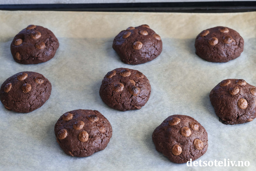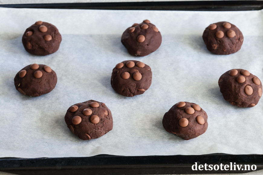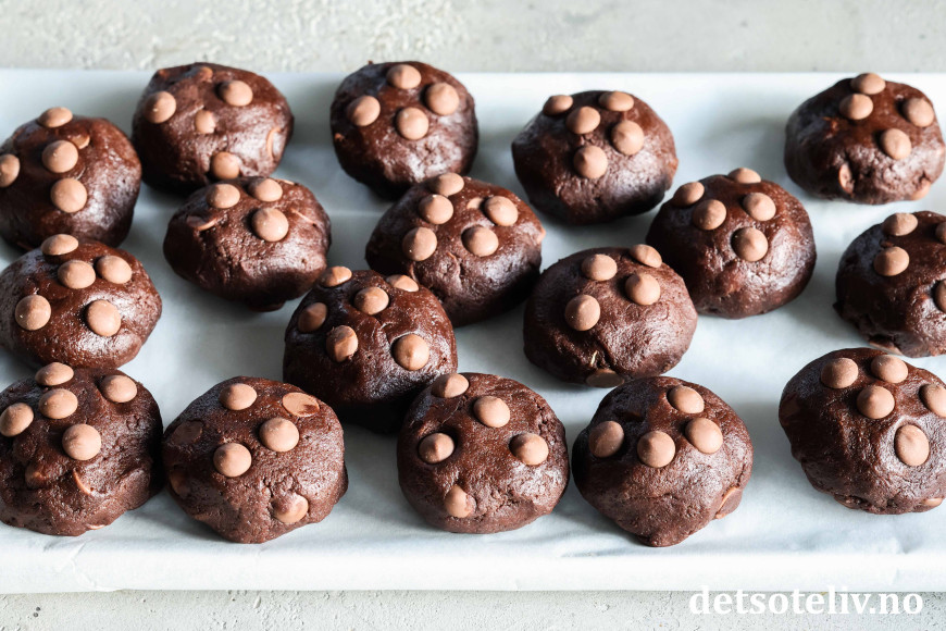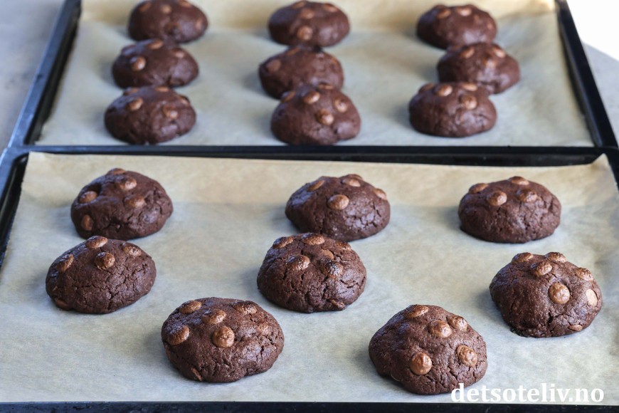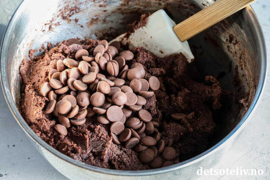 Pisk mykt smør sammen med hvitt og brunt sukker. Pisk inn eggene, ett om gangen. Sikt hvetemel sammen med bakepulver og kakaopulver. Bland dette inn så du får en tykk sjokoladedeig. Vend inn melkesjokoladeknapper.